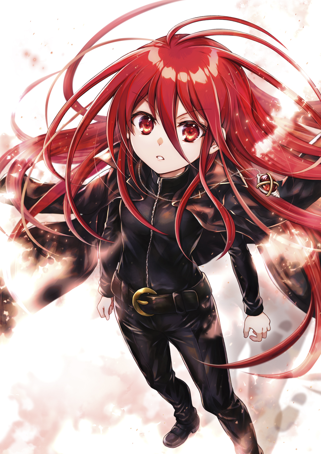 1girl belt belt_buckle black_belt black_jacket black_pants black_shirt black_shoes buckle comiket_102 commentary_request feet_out_of_frame fire from_above hair_between_eyes highres jacket jacket_on_shoulders long_hair long_sleeves looking_at_viewer looking_up pants parted_lips red_eyes red_hair shakugan_no_shana shana shirt shoes solo standing tachitsu_teto v-shaped_eyebrows very_long_hair