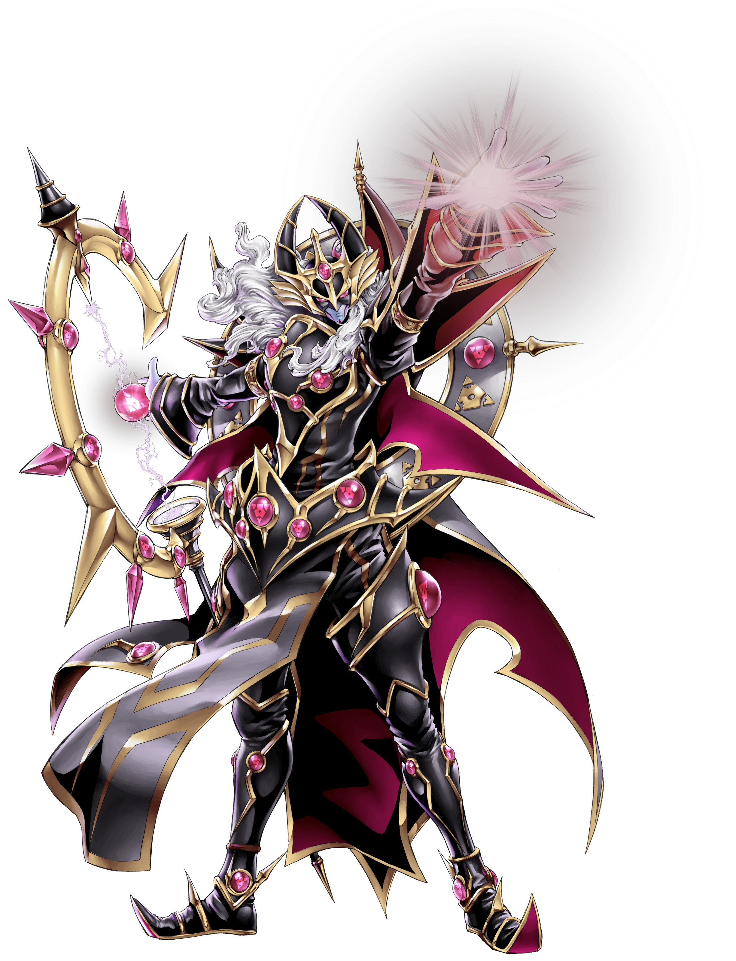 1boy absurdres armor cape endymion_(yu-gi-oh!) endymion_the_mighty_master_of_magic highres holding holding_weapon konami long_hair looking_at_viewer magic official_art pelvic_curtain serious simple_background solo weapon yu-gi-oh!