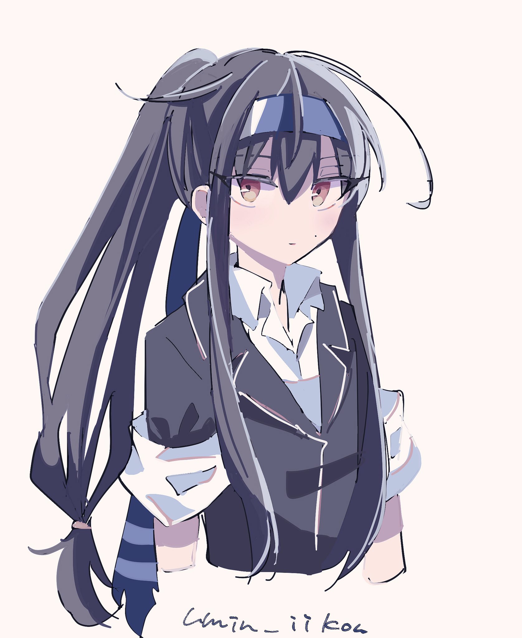 1girl alternate_hairstyle black_hair blazer blue_headband collared_shirt commentary_request dress_shirt hatsushimo_(kancolle) headband highres jacket kantai_collection long_hair low-tied_long_hair ponytail red_eyes samekun_(samekun_s) shirt simple_background solo twitter_username upper_body white_background white_shirt