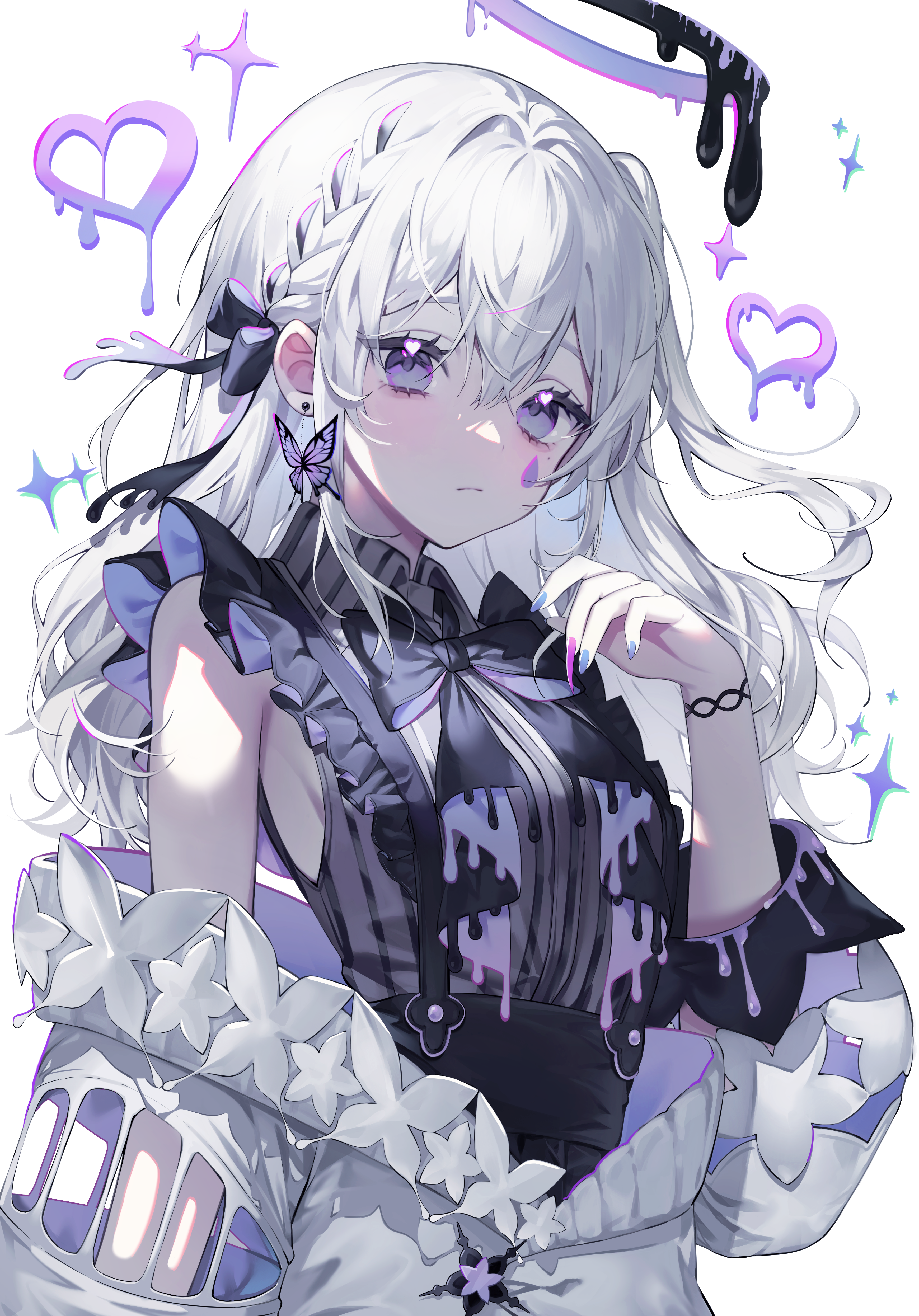 1girl absurdres bizette black_bow black_bowtie black_shirt blue_nails bow bowtie braid butterfly_earrings commentary earrings floating_earrings halo hand_up heart heart_in_eye highres jacket jewelry long_hair looking_at_viewer off_shoulder open_clothes open_jacket original parted_lips pink_nails purple_eyes shirt side_ponytail sleeveless sleeveless_shirt solo symbol_in_eye upper_body white_background white_hair white_jacket