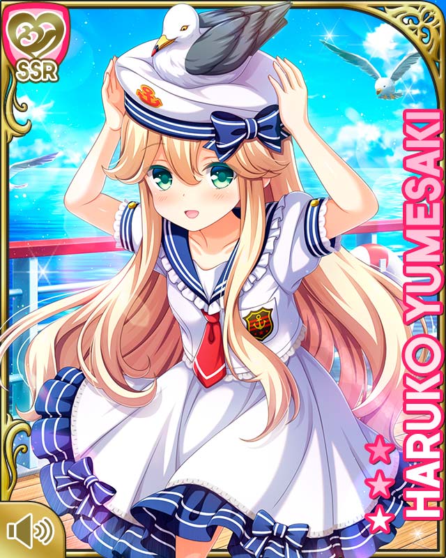 1girl :d animal animal_on_head bare_arms bird blonde_hair card_(medium) character_name day dress girlfriend_(kari) green_eyes hat long_hair necktie ocean official_art on_head open_mouth outdoors qp:flapper red_necktie sailor_dress sailor_hat seagull ship smile standing tagme watercraft white_dress white_headwear yumesaki_haruko