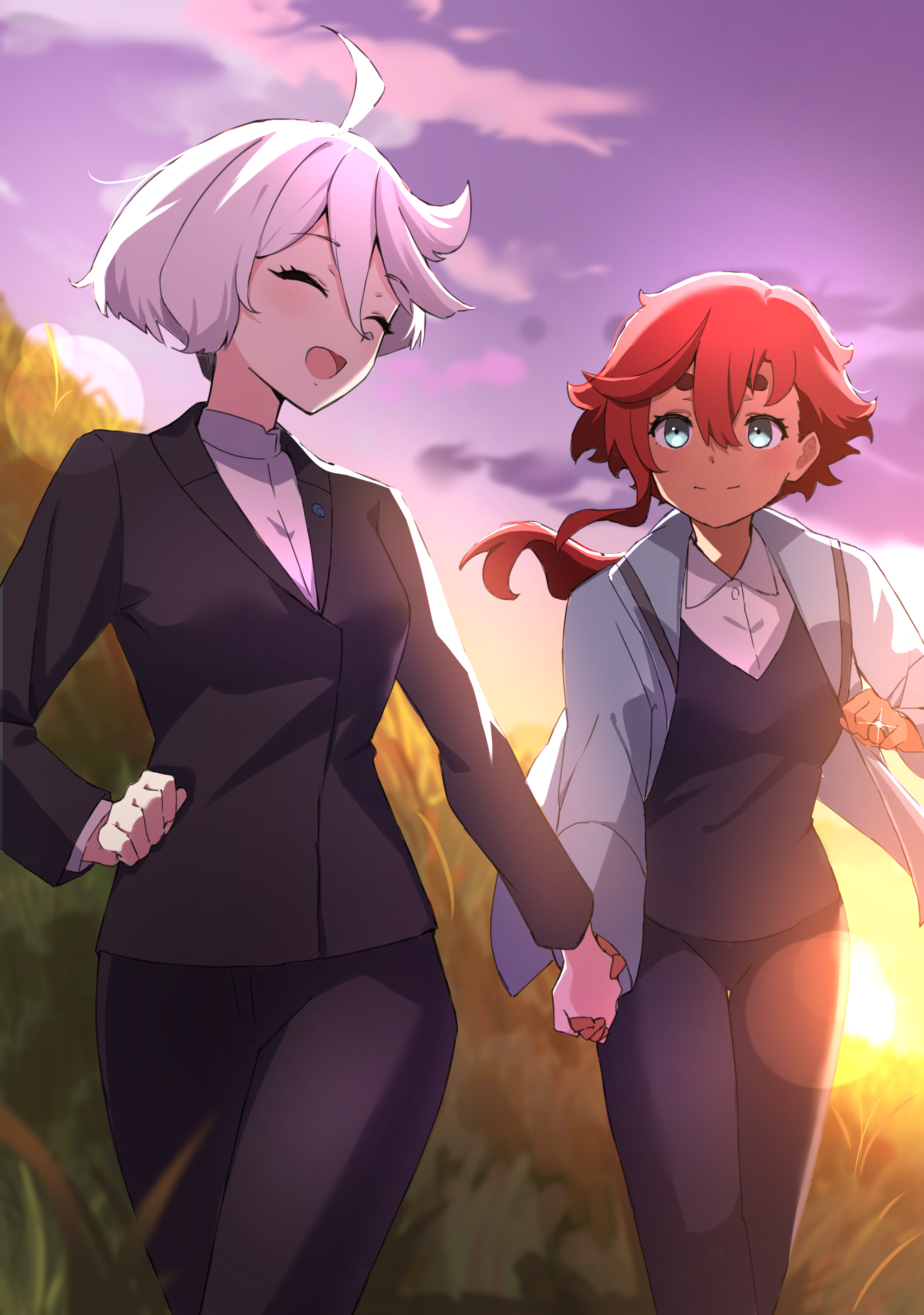 2girls absurdres blue_eyes channyy19 closed_eyes cloud dark-skinned_female dark_skin field formal_clothes gundam gundam_suisei_no_majo highres holding_hands jacket jewelry long_hair miorine_rembran multiple_girls open_mouth pant_suit pants purple_sky red_hair ring short_hair sky suit suletta_mercury sunset wedding_ring white_hair wife_and_wife yuri
