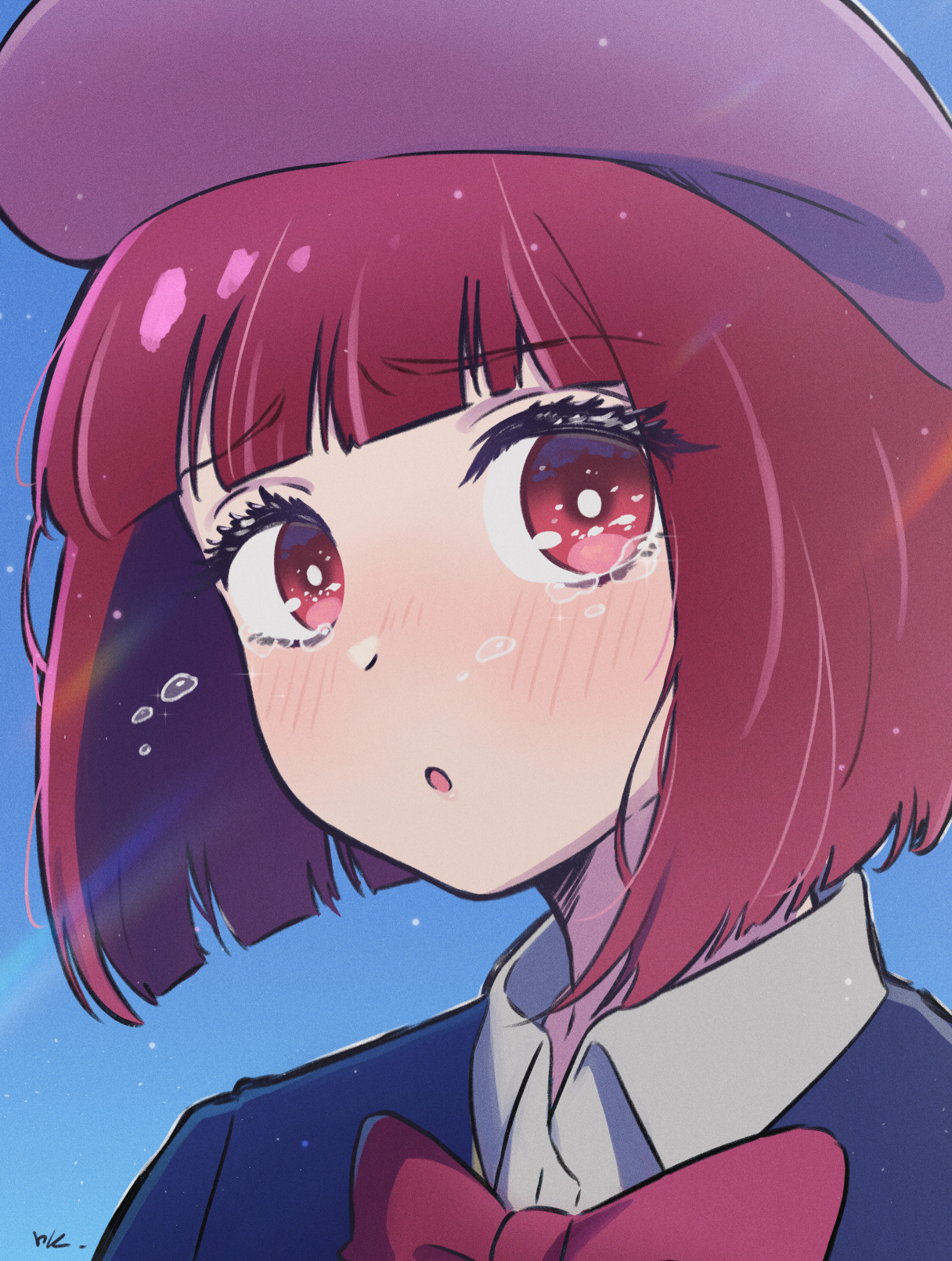 1girl arima_kana blue_jacket blush crying hat highres jacket nekonbini open_mouth oshi_no_ko pink_ribbon purple_headwear red_eyes red_hair ribbon school_uniform short_hair unhappy youtou_high_school_uniform