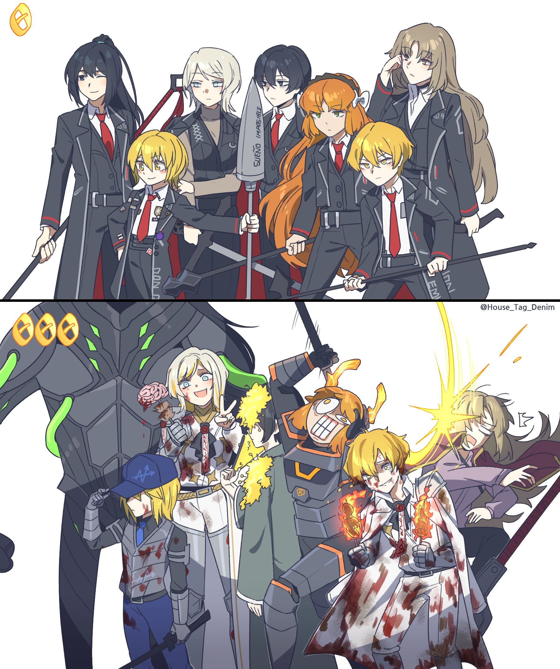 3boys 4girls antlers armor axe baseball_cap black_hair blonde_hair blue_eyes blue_hair blue_hairband blue_necktie bob_cut brain cape coat collared_shirt commentary crying don_quixote_(project_moon) e.g.o_(project_moon) faust_(project_moon) fire flower gameplay_mechanics gauntlets green_eyes grey_hair guan_dao hair_ribbon hairband halberd hanbok hand_fan hat headband high_ponytail highres holding holding_axe holding_skewer hong_lu_(project_moon) horns house_tag_denim ishmael_(project_moon) korean_clothes lance limbus_company long_hair mace multicolored_hair multiple_boys multiple_girls necktie one_eye_closed orange_hair overcoat polearm ponytail project_moon red_necktie ribbon rodion_(project_moon) shirt sinclair_(project_moon) single_gauntlet skewer spicebush_(e.g.o) streaming_tears sweater sword untranslatable_commentary tears tube turtleneck turtleneck_sweater twitter_username vest wavy_hair weapon white_shirt yellow_eyes yi_sang_(project_moon) zweihander