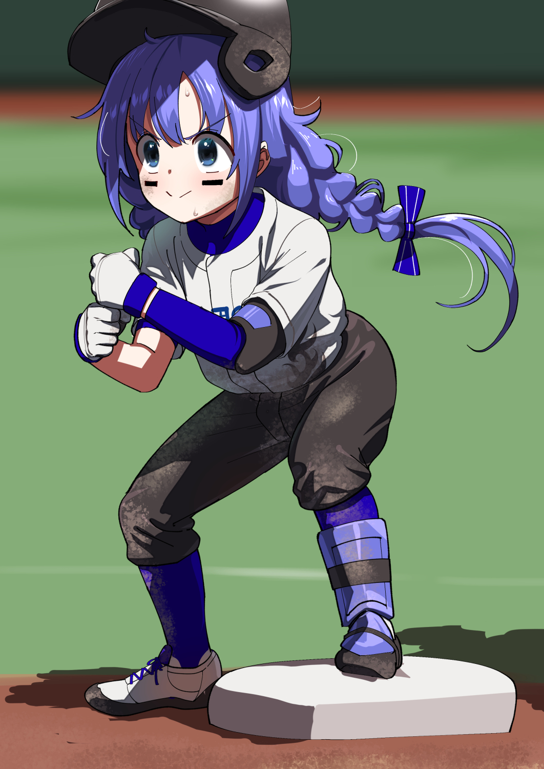 >:) 1girl baseball_helmet baseball_uniform black_headwear black_pants blue_eyes blue_hair blue_socks blurry blurry_background braid closed_mouth commentary_request depth_of_field dirty dirty_clothes dirty_face facial_mark full_body gloves helmet highres layered_sleeves long_hair long_sleeves low_twintails nijisanji pants pettan_p shirt shoes short_over_long_sleeves short_sleeves smile socks solo sportswear squatting standing sweat twin_braids twintails v-shaped_eyebrows very_long_hair virtual_youtuber white_gloves white_shirt white_shoes yuuki_chihiro