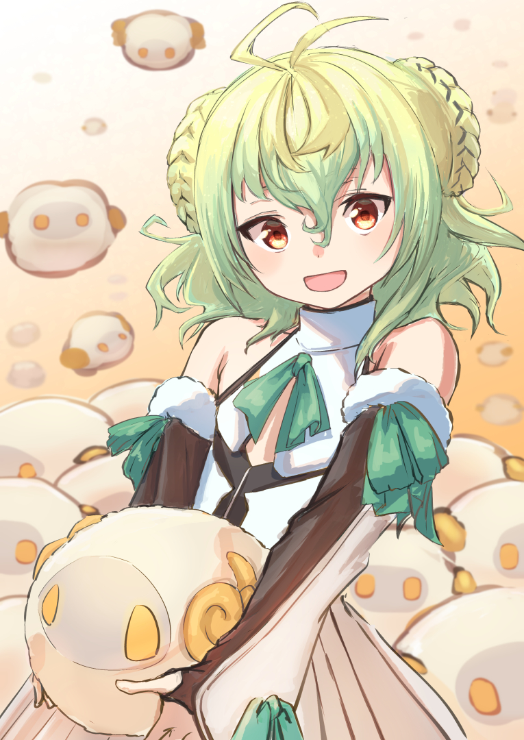 1boy animal apollo_(fate) bare_shoulders detached_sleeves fate/grand_order fate_(series) green_hair green_ribbon holding holding_animal horns male_focus medium_hair nyantiu open_mouth orange_eyes paris_(fate) ribbon sheep sheep_horns sleeve_ribbon trap