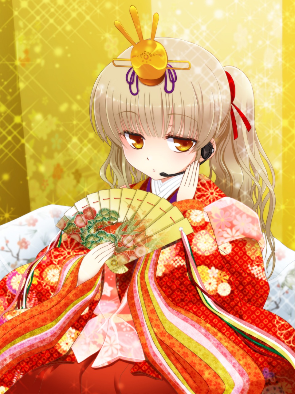 1girl alternate_costume alternate_hairstyle angel_beats! blonde_hair blunt_bangs commentary_request earpiece expressionless eyelashes fingernails floral_print folding_fan hair_ribbon hand_fan hand_up highres hina_ningyou hinamatsuri hirabitai holding holding_fan ikeda_jun_(aquaqua) japanese_clothes kimono light_blush long_hair long_sleeves looking_to_the_side orange_eyes parted_lips ponytail red_kimono red_ribbon ribbon second-party_source simple_background solo sparkle wavy_hair wide_sleeves yellow_background yusa_(angel_beats!)