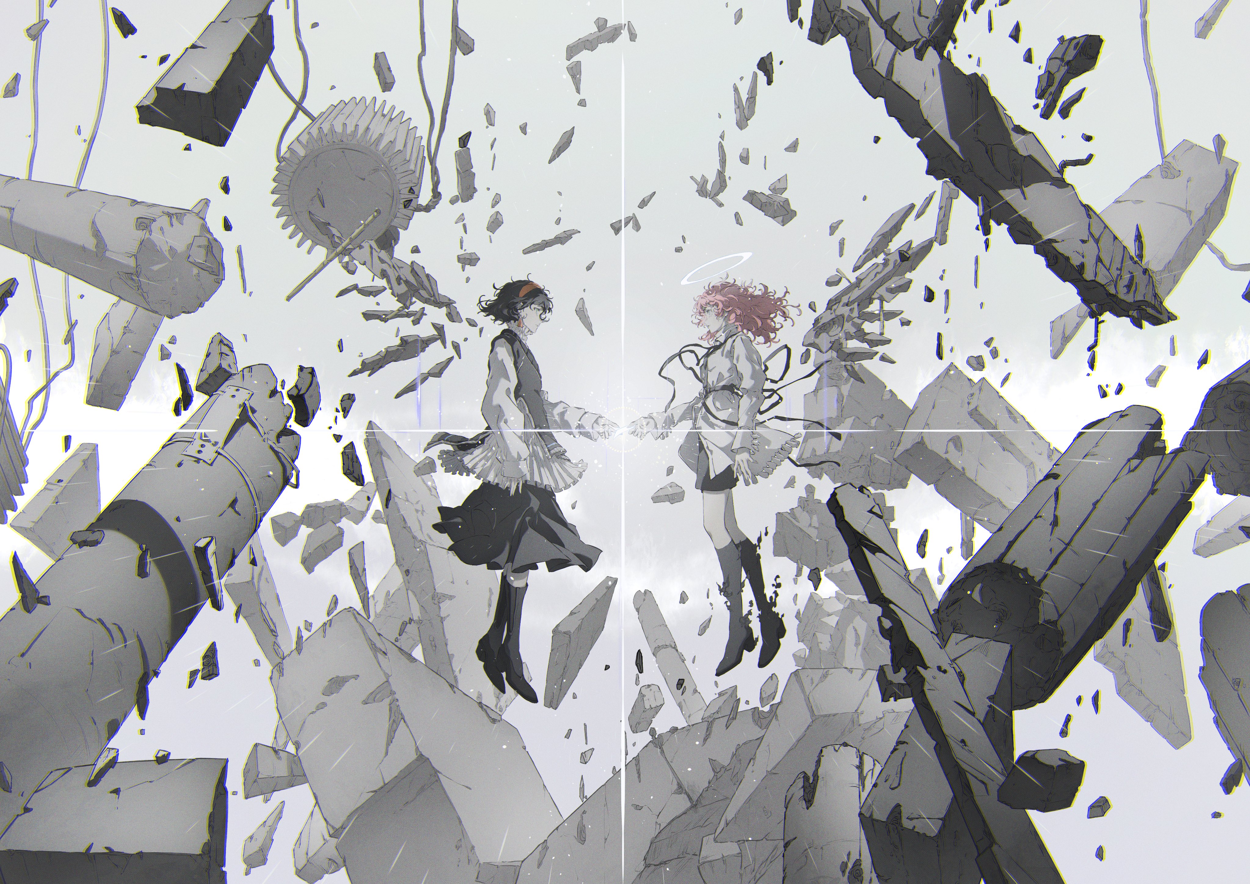 2girls absurdres arm_at_side belt black_footwear black_ribbon black_shorts black_skirt black_socks broken cable card debris dissolving earrings eye_contact floating floating_hair frilled_shirt frilled_shirt_collar frills fringe_trim giving glowing green_eyes hairband halo highres holding holding_card jewelry kneehighs layered_shirt lens_flare long_hair looking_at_another multiple_girls original partially_colored pink_hair profile reaching ribbon ruins shirt shoes short_hair shorts single_wing skirt socks solani spot_color sweater_vest tassel utility_pole white_shirt wide_shot wings