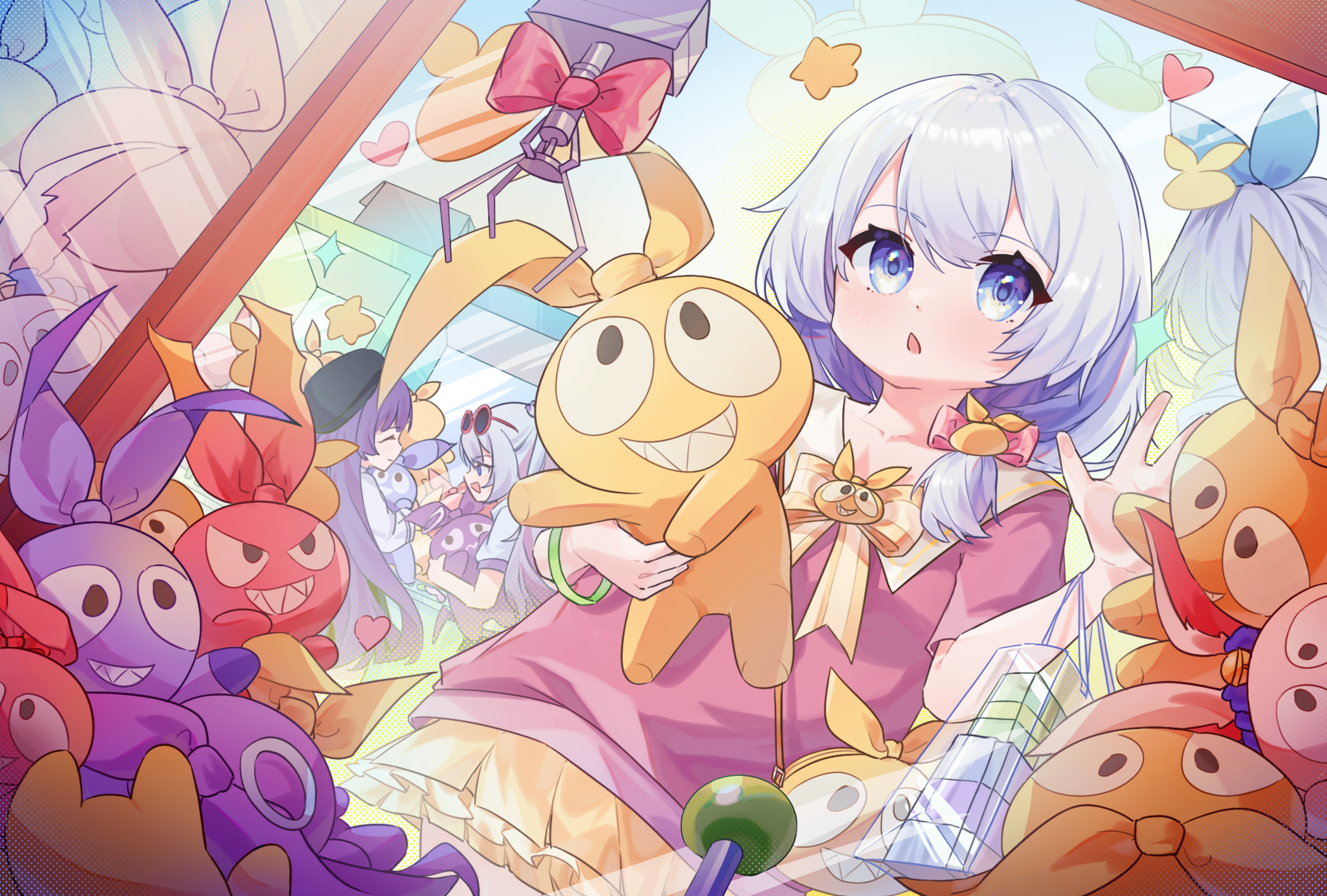 4girls beret black_headwear blue_eyes blue_ribbon bow bronya_zaychik brown_skirt collared_shirt commentary_request crane_game eyewear_on_head frilled_skirt frills grey_hair hair_between_eyes hair_ribbon hat heart highres hola_(honkai_impact) holi_(honkai_impact) homei_(honkai_impact) homi_(honkai_impact) homu_(honkai_impact) honkai_(series) honkai_impact_3rd howo_(honkai_impact) kiana_kaslana mogu_kinoko multiple_girls pink_shirt ponytail profile purple_hair raiden_mei red-framed_eyewear red_bow ribbon sharp_teeth shirt short_sleeves skirt star_(symbol) striped_bow stuffed_animal stuffed_toy sunglasses teeth theresa_apocalypse white_shirt