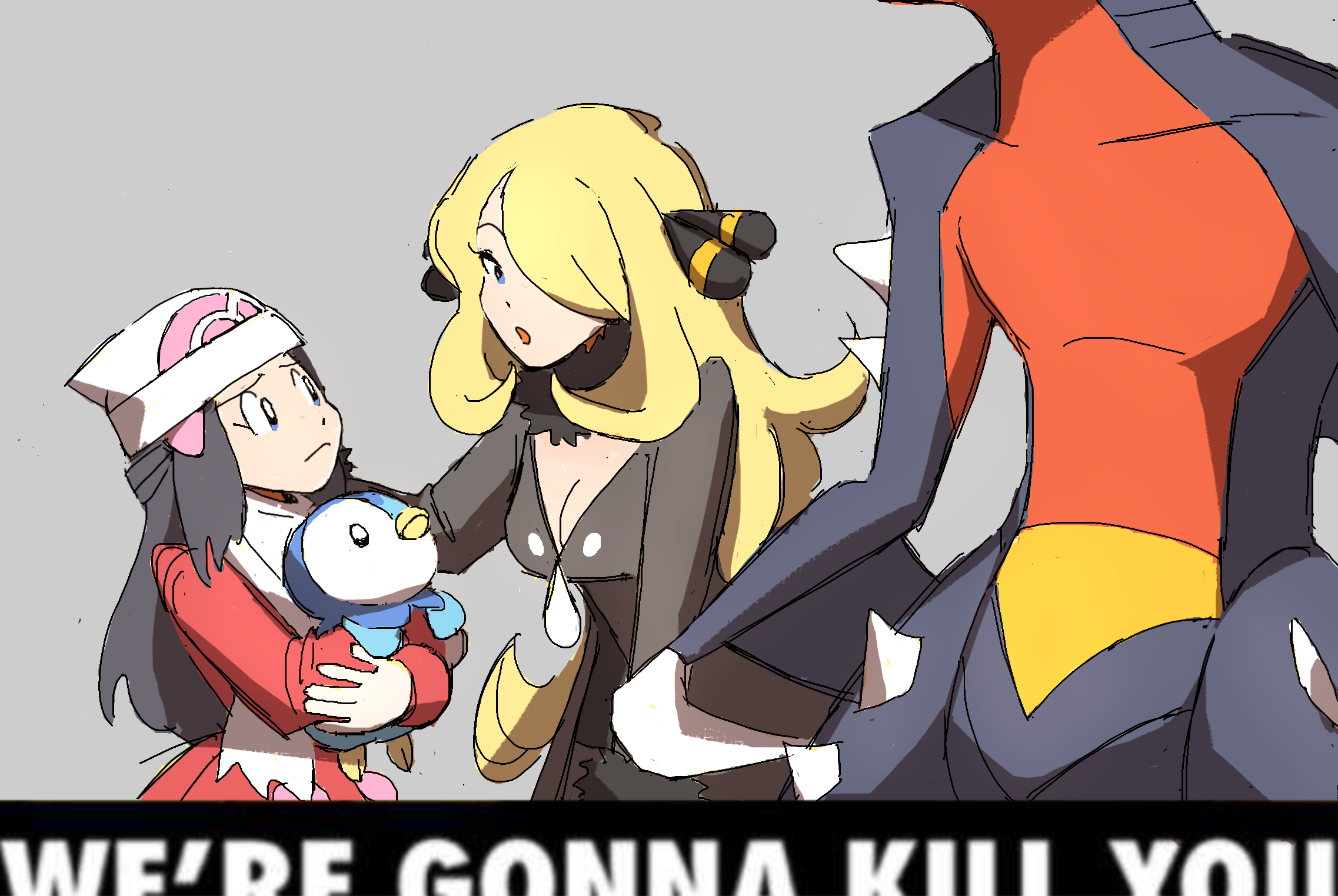 2girls black_coat black_hair blonde_hair coat cynthia_(pokemon) dawn_(pokemon) drawfag garchomp gen_4_pokemon hat highres meme multiple_girls nervous nintendo piplup pokemon pokemon_dppt pokemon_platinum realbigtigers red_coat scared spongebob_squarepants_(series) we're_gonna_kill_you_(meme)