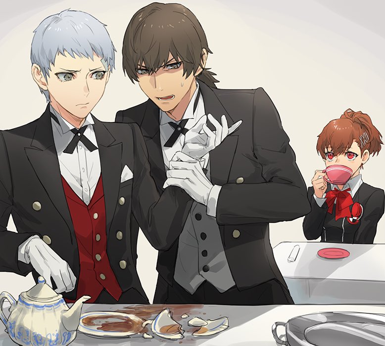 1girl 2boys aragaki_shinjirou black_jacket bow bowtie broken_cup brown_hair closed_mouth collared_shirt cup gekkoukan_high_school_uniform gloves grey_eyes grey_hair grey_vest hair_ornament hairclip holding holding_cup isa_(peien516) jacket long_sleeves multiple_boys open_mouth persona persona_3 persona_3_portable ponytail red_eyes red_vest sanada_akihiko school_uniform shiomi_kotone shirt sweat vest white_gloves white_shirt