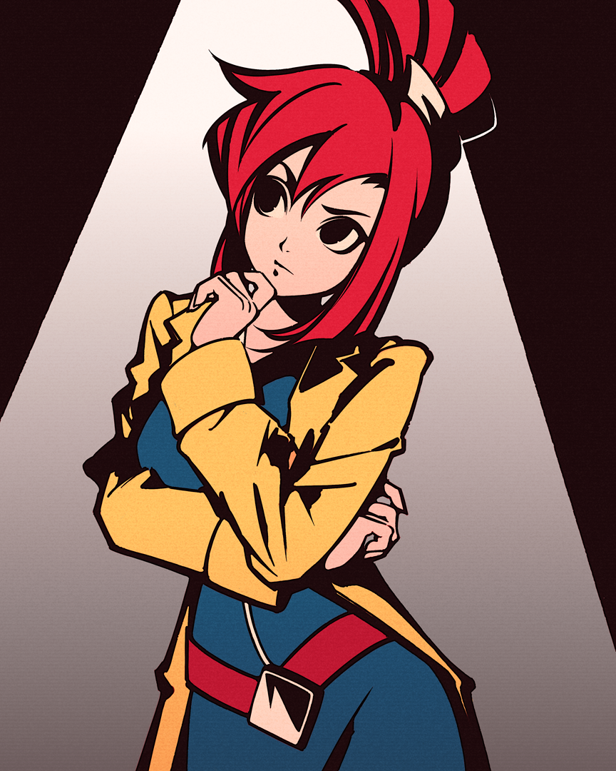 1girl arm_under_breasts belt black_background black_eyes blue_dress breasts closed_mouth coat commentary cowboy_shot dress english_commentary ghost_trick grey_background hair_between_eyes hair_ornament hand_on_own_chin head_tilt high_contrast impossible_hair long_hair long_sleeves looking_to_the_side looking_up lynne_(ghost_trick) medium_breasts moshimoshibe pensive ponytail raised_eyebrow red_belt red_hair spotlight thinking trench_coat yellow_coat