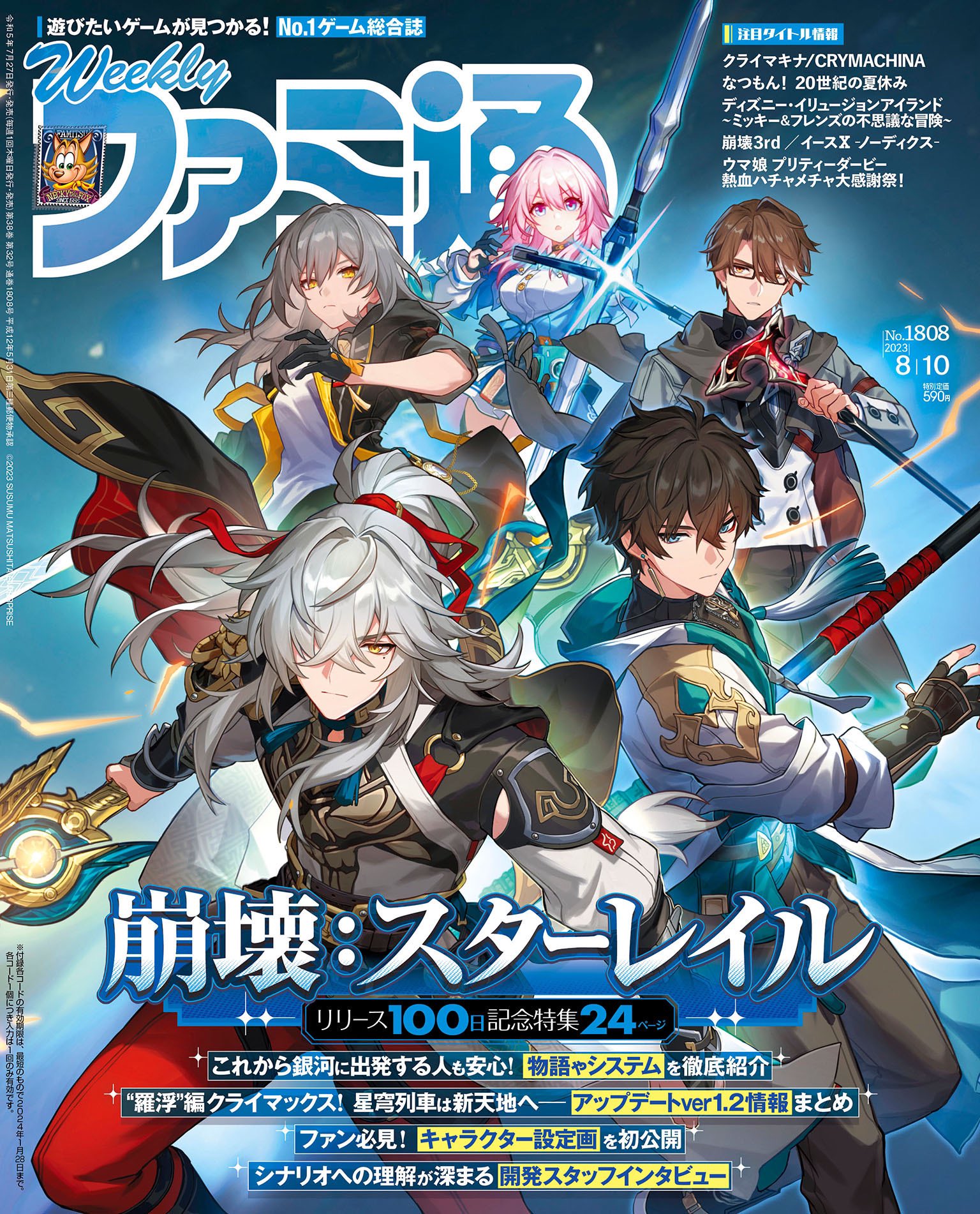 2girls 3boys :o ahoge black_gloves black_hair black_pants blue_skirt bow_(weapon) brown_hair cane chinese_clothes closed_mouth coat dan_heng_(honkai:_star_rail) dan_heng_(hunt)_(honkai:_star_rail) eyeliner famitsu glasses gloves green_eyes grey_hair hair_over_one_eye hairband high_ponytail highres holding holding_bow_(weapon) holding_cane holding_sword holding_weapon honkai:_star_rail honkai_(series) jacket jing_yuan logo long_hair long_sleeves makeup march_7th_(honkai:_star_rail) march_7th_(preservation)_(honkai:_star_rail) mole mole_under_eye multiple_boys multiple_girls official_art open_clothes open_hands open_jacket open_mouth pants pink_hair ponytail red_eyeliner red_hairband red_pants shirt short_hair skirt stelle_(honkai:_star_rail) sword third-party_edit tied_jacket trailblazer_(honkai:_star_rail) v-shaped_eyebrows weapon white_coat white_hair white_shirt yellow_eyes