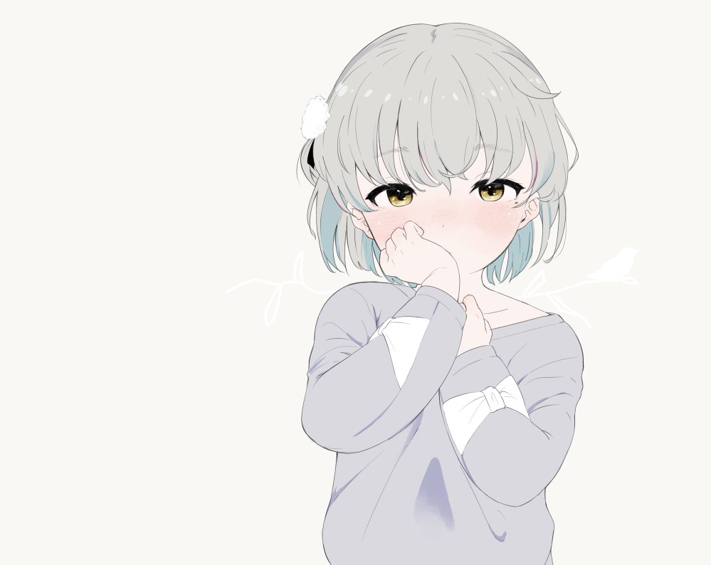 1girl alternate_costume bird black_ribbon bow branch brown_eyes collarbone colored_inner_hair covering_own_mouth flower grey_background grey_hair grey_shirt hair_flower hair_ornament hair_ribbon hand_to_own_mouth hands_up hatoba_tsugu long_sleeves looking_at_viewer mole mole_under_eye multicolored_hair nekopantsu_(blt) raised_eyebrows ribbon shirt silhouette sleeve_bow solo straight-on tsugu_(vtuber) upper_body virtual_youtuber white_bow white_flower