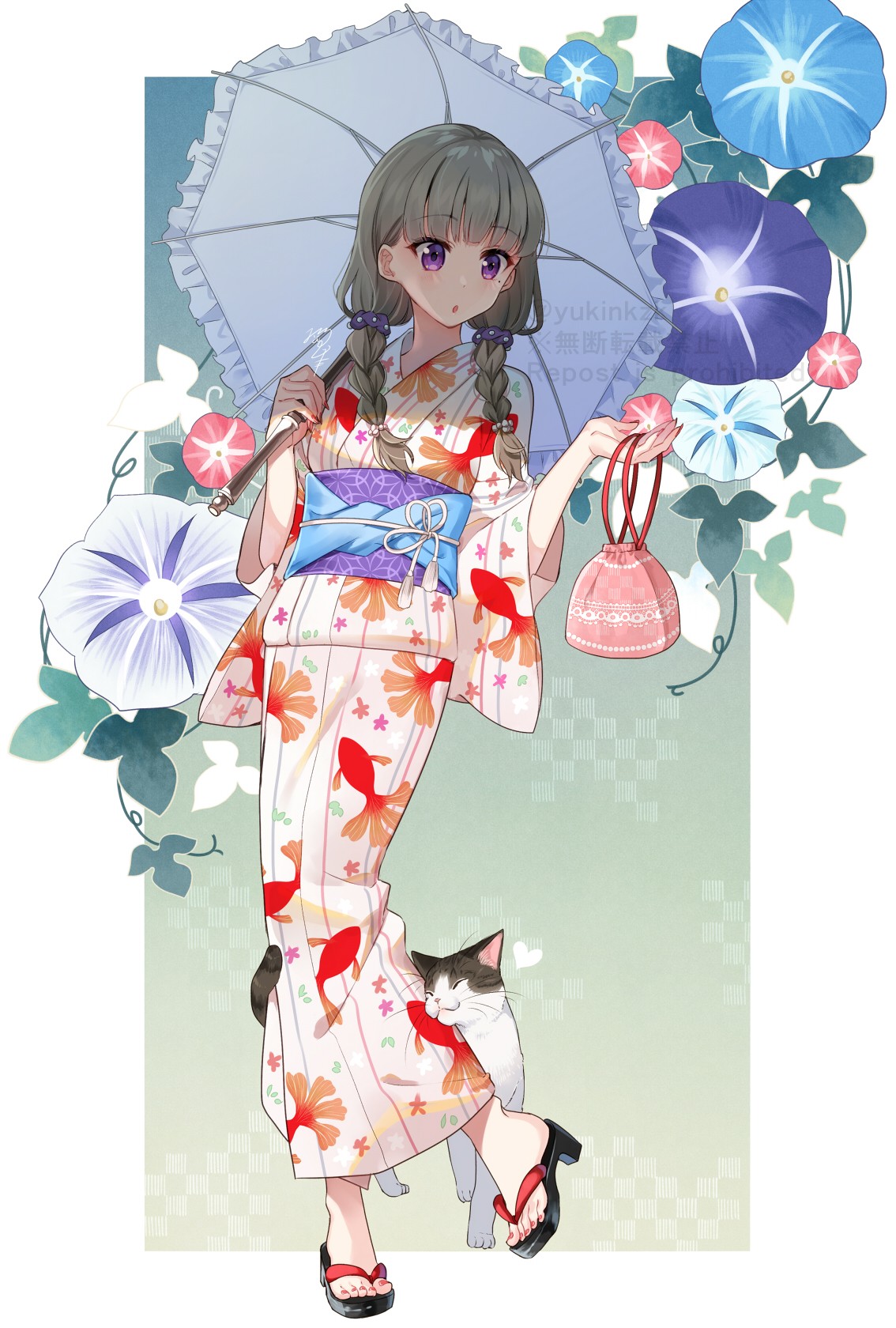 1girl animal animal_print black_sandals blue_flower cat commentary_request fish_print flower goldfish_print grey_hair hair_ornament hair_over_shoulder hair_scrunchie high_heel_sandals high_heels highres japanese_clothes kimono long_hair long_sleeves looking_down looking_to_the_side low_twintails nekozuki_yuki original parted_lips print_kimono purple_eyes purple_flower purple_scrunchie red_flower sandals scrunchie solo standing standing_on_one_leg twintails twitter_username watermark white_kimono wide_sleeves yukata zouri