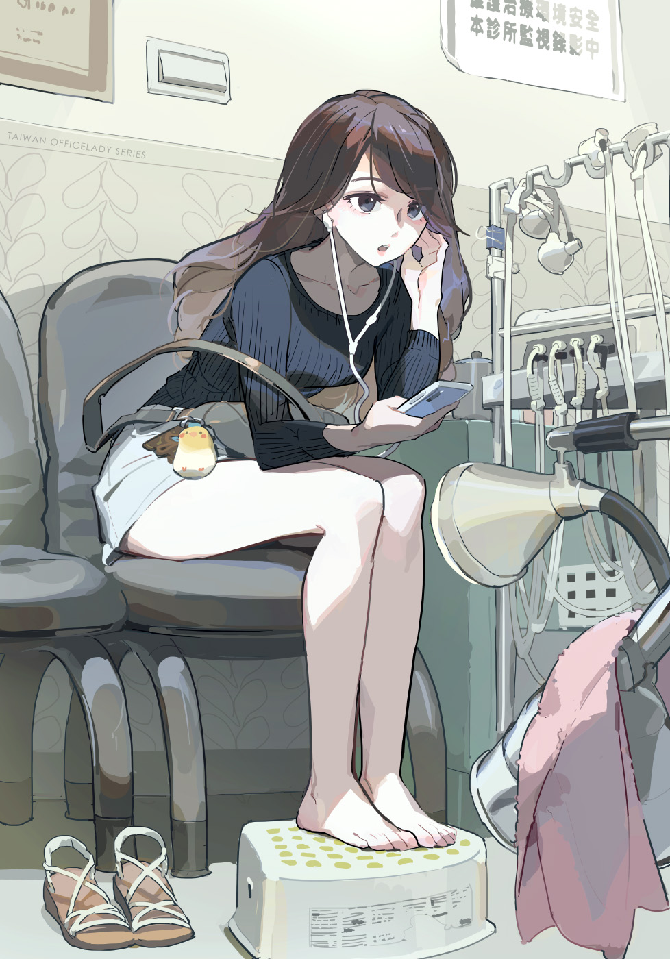 1girl adjusting_earphones bare_legs barefoot black_eyes black_hair black_shirt cellphone chair commentary_request earphones full_body grey_shorts highres holding holding_phone indoors leaning_forward long_hair long_sleeves office_lady_taiwan on_chair open_mouth original phone sandals shirt shorts sitting slippers smartphone solo taiwan tennohi unworn_sandals