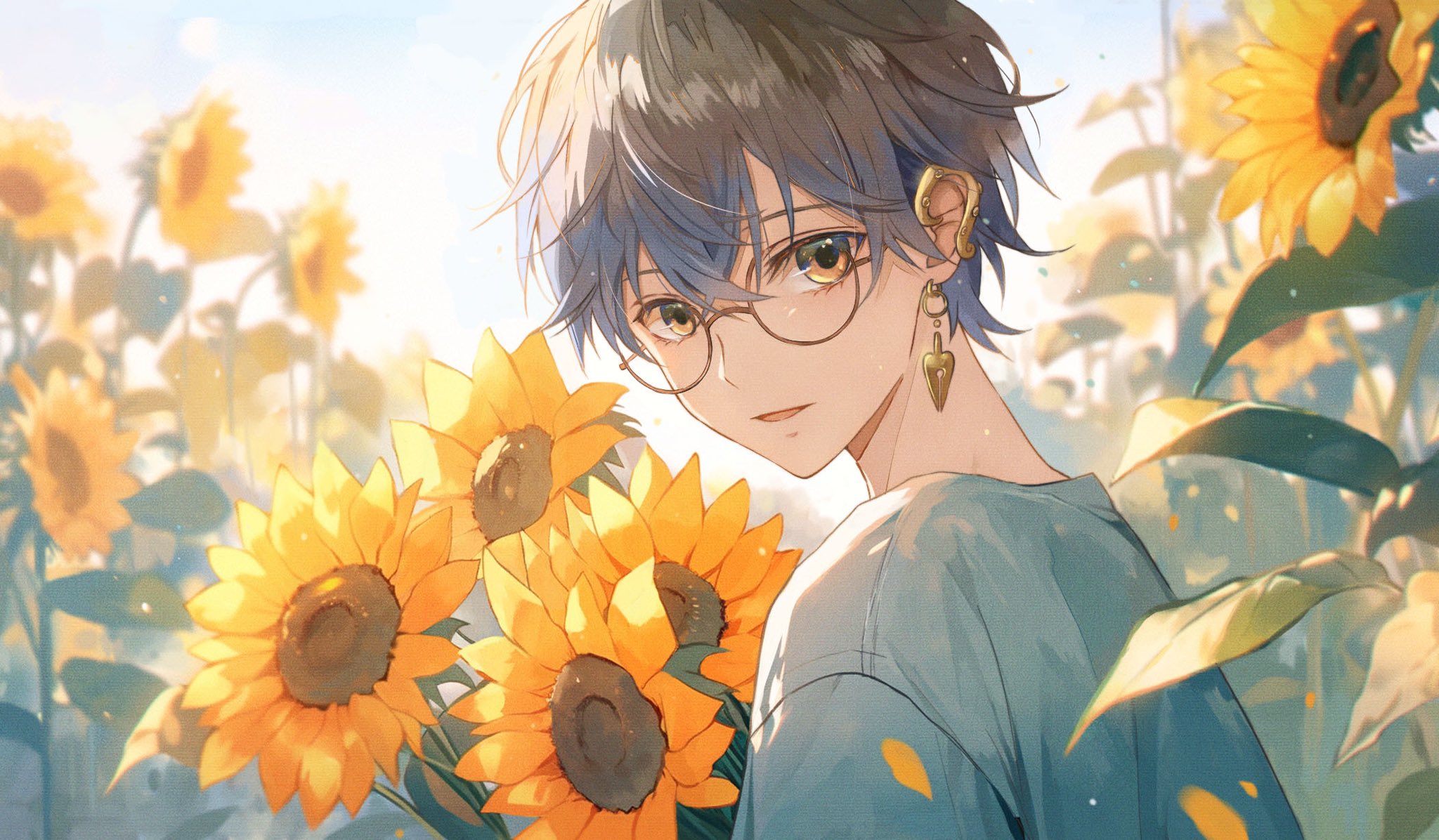 1boy blue_hair blue_shirt brown_hair commentary earrings flower glasses gradient_hair green_eyes highres ike_eveland jewelry looking_at_viewer male_focus multicolored_eyes multicolored_hair nijisanji nijisanji_en open_mouth round_eyewear shenlan_echo shirt short_hair smile solo sunflower untranslatable_commentary virtual_youtuber yellow_eyes yellow_flower