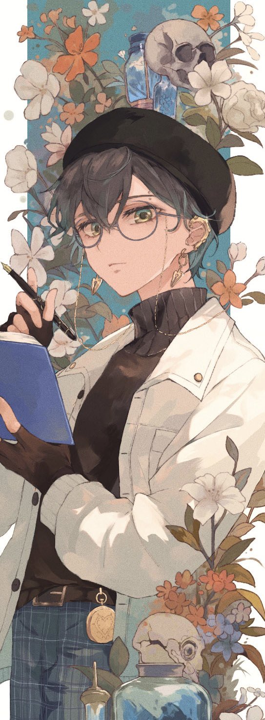 belt beret black_belt black_gloves black_hat black_shirt blue_pants brown_hair closed_mouth ear_piercing earrings fingerless_gloves flower gloves green_eyes hair_between_eyes hat highres holding holding_notebook holding_pen ike_eveland jacket jewelry leaf looking_at_viewer male_focus nijisanji nijisanji_en notebook pants pen piercing red_flower shenlan_echo shirt short_hair sidelocks simple_background skull solo standing virtual_youtuber white_flower white_jacket