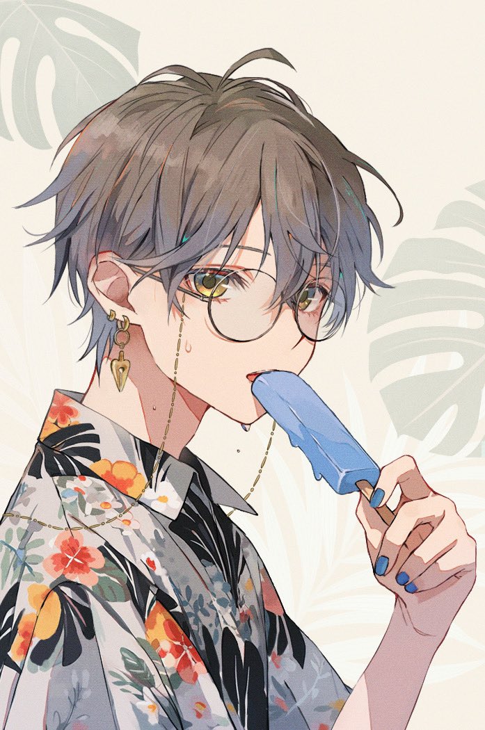 1boy blue_nails brown_hair ear_piercing earrings floral_print food glasses gradient_hair green_eyes hair_between_eyes holding holding_food holding_ice_cream ice_cream ike_eveland jewelry looking_at_viewer multicolored_hair nail_polish nijisanji nijisanji_en open_mouth patterned_clothing piercing shenlan_echo shirt short_sleeves sidelocks simple_background solo sweatdrop upper_body virtual_youtuber