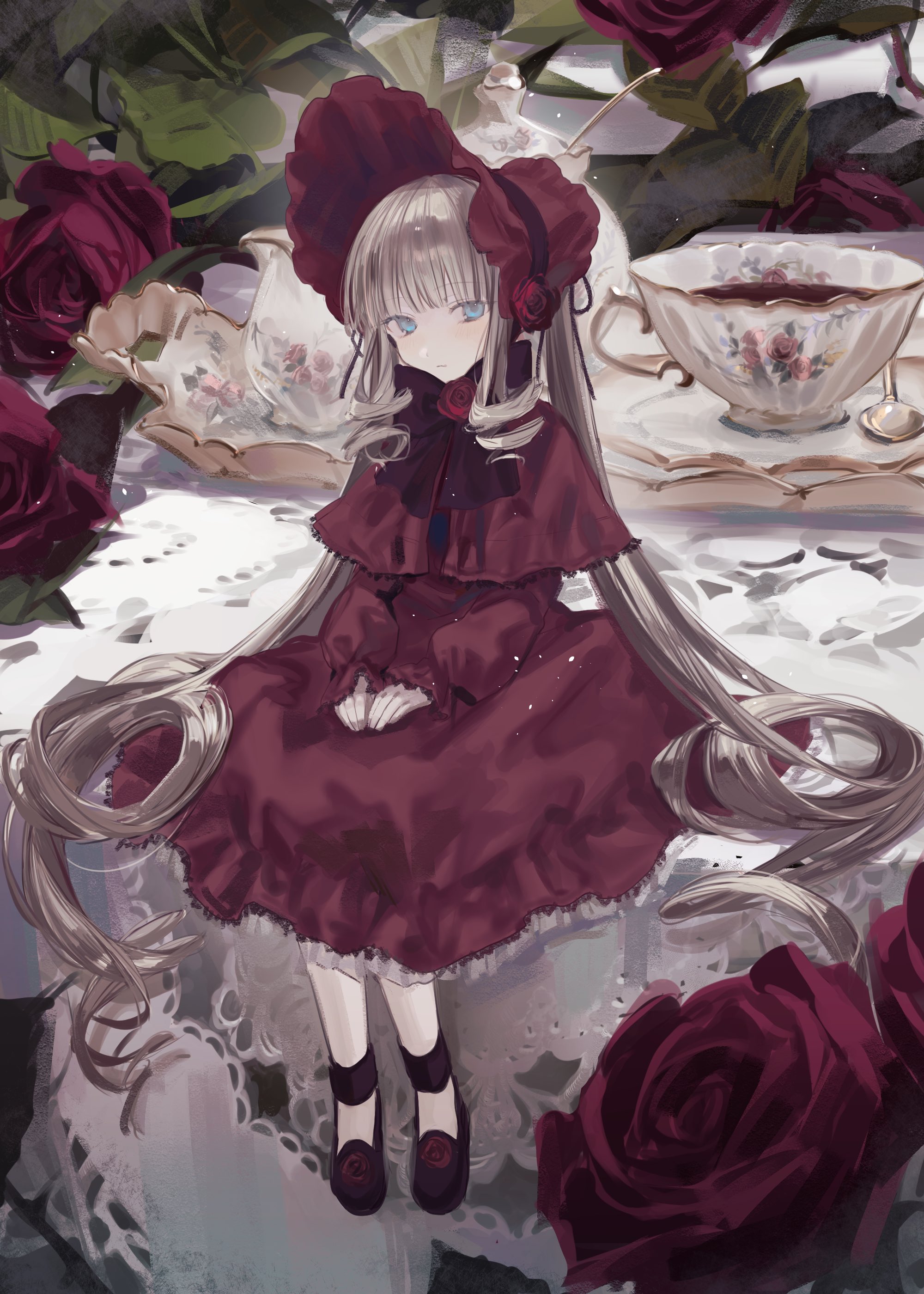 1girl absurdres blonde_hair blue_eyes bonnet capelet classic_lolita cup dress drill_hair drill_sidelocks flower frilled_dress frills highres lolita_fashion long_dress long_hair long_sleeves red_capelet red_dress red_flower red_headwear red_rose rose rozen_maiden senri_(rnd_024) shinku sidelocks solo teacup twintails very_long_hair