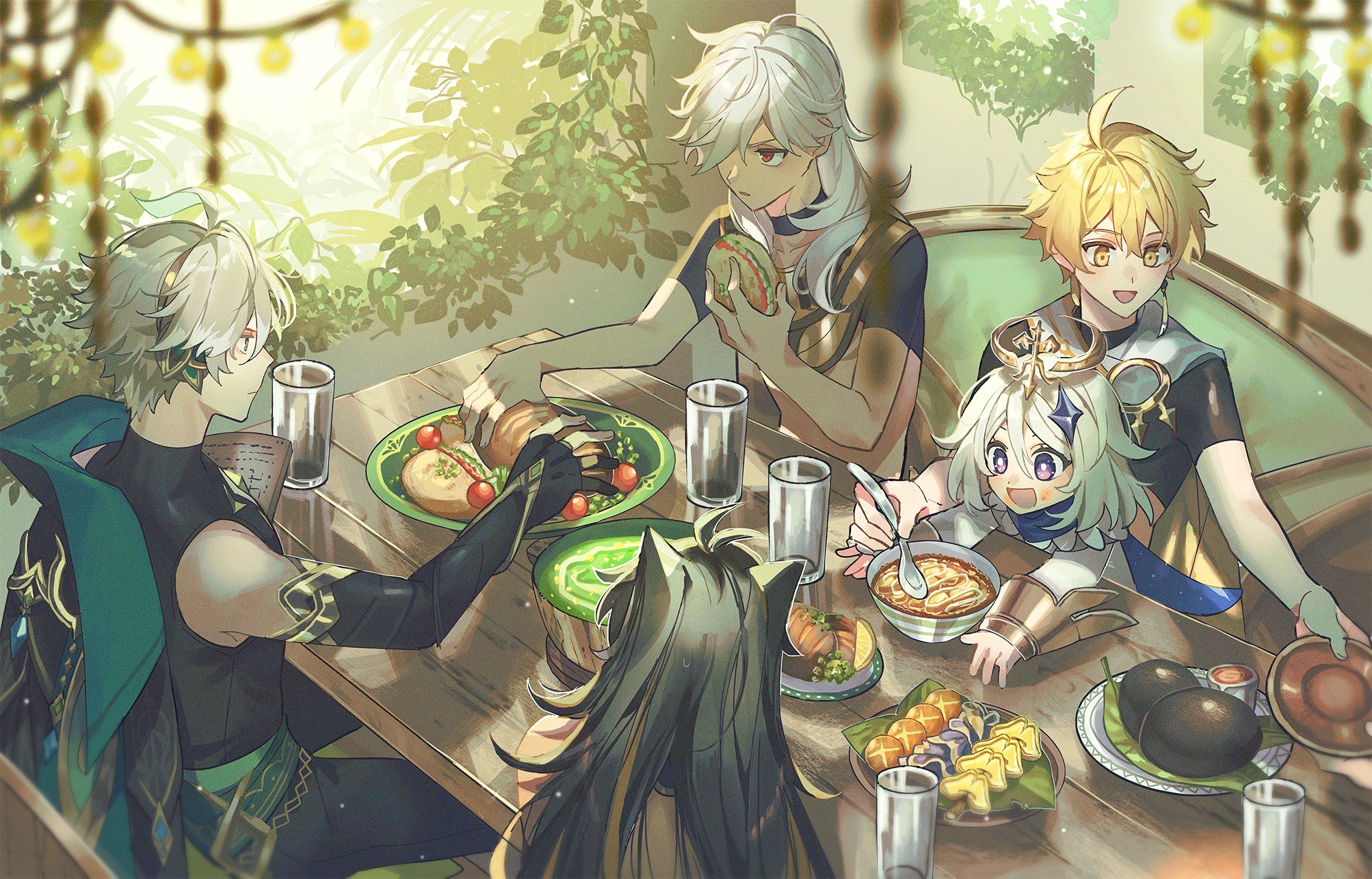 2girls 3boys aether_(genshin_impact) alhaitham_(genshin_impact) black_choker black_hair black_pants book bow choker couch cup cyno_(genshin_impact) dehya_(genshin_impact) detached_sleeves earrings eating food genshin_impact gloves grey_hair gurugnsn hair_between_eyes hair_ears hair_ornament highres holding jewelry long_hair multicolored_hair multiple_boys multiple_girls open_mouth paimon_(genshin_impact) pants partially_fingerless_gloves plant plate red_eyes short_sleeves single_earring sitting slice_of_life spoon table