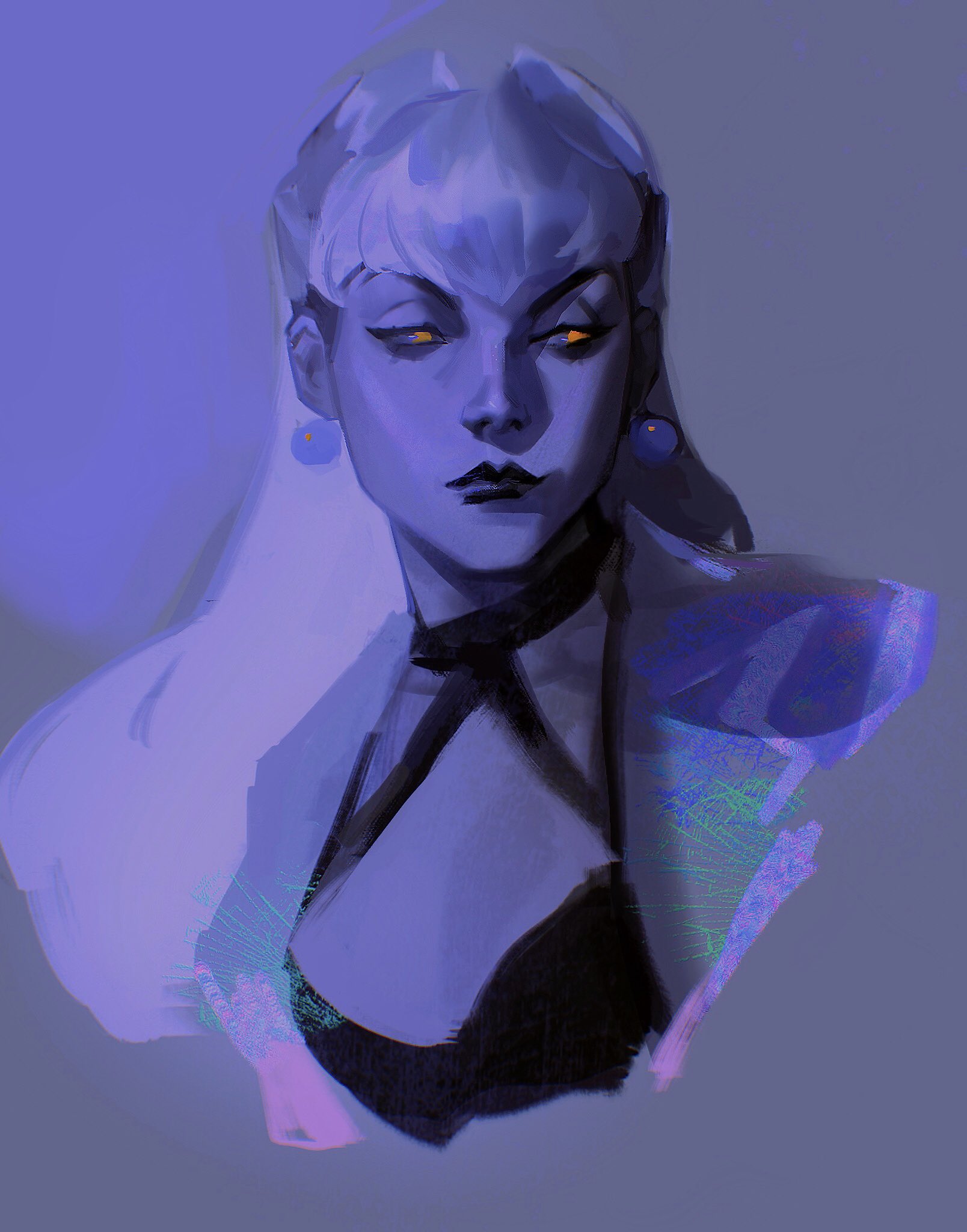1girl aina_(mayexplode) asymmetrical_bangs black_lips cone_hair_bun earrings evelynn_(league_of_legends) expressionless floating_earrings hair_bun highres jewelry k/da_all_out_evelynn league_of_legends long_hair looking_to_the_side mature_female purple_background solo the_baddest_evelynn upper_body white_hair yellow_eyes