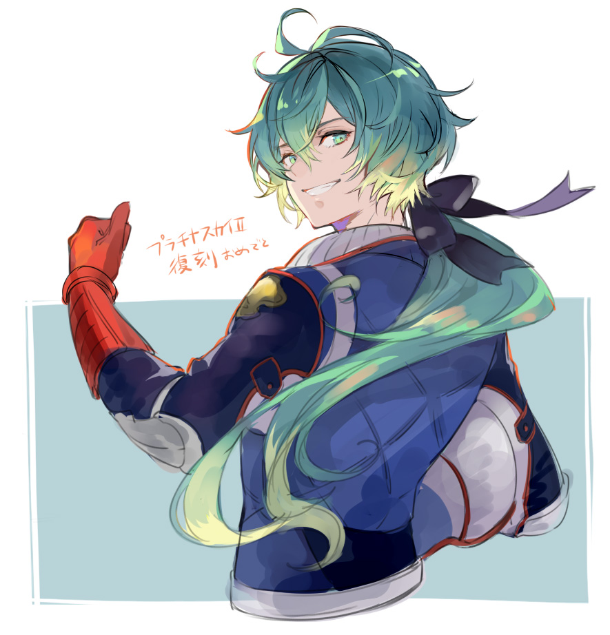 1boy blue_jacket carrying carrying_under_arm cropped_torso gloves granblue_fantasy green_eyes green_hair grin helmet jacket long_hair long_sleeves looking_at_viewer looking_back low_ponytail male_focus meteon_(granblue_fantasy) osamu_(jagabata) ponytail red_gloves smile thumbs_up translation_request