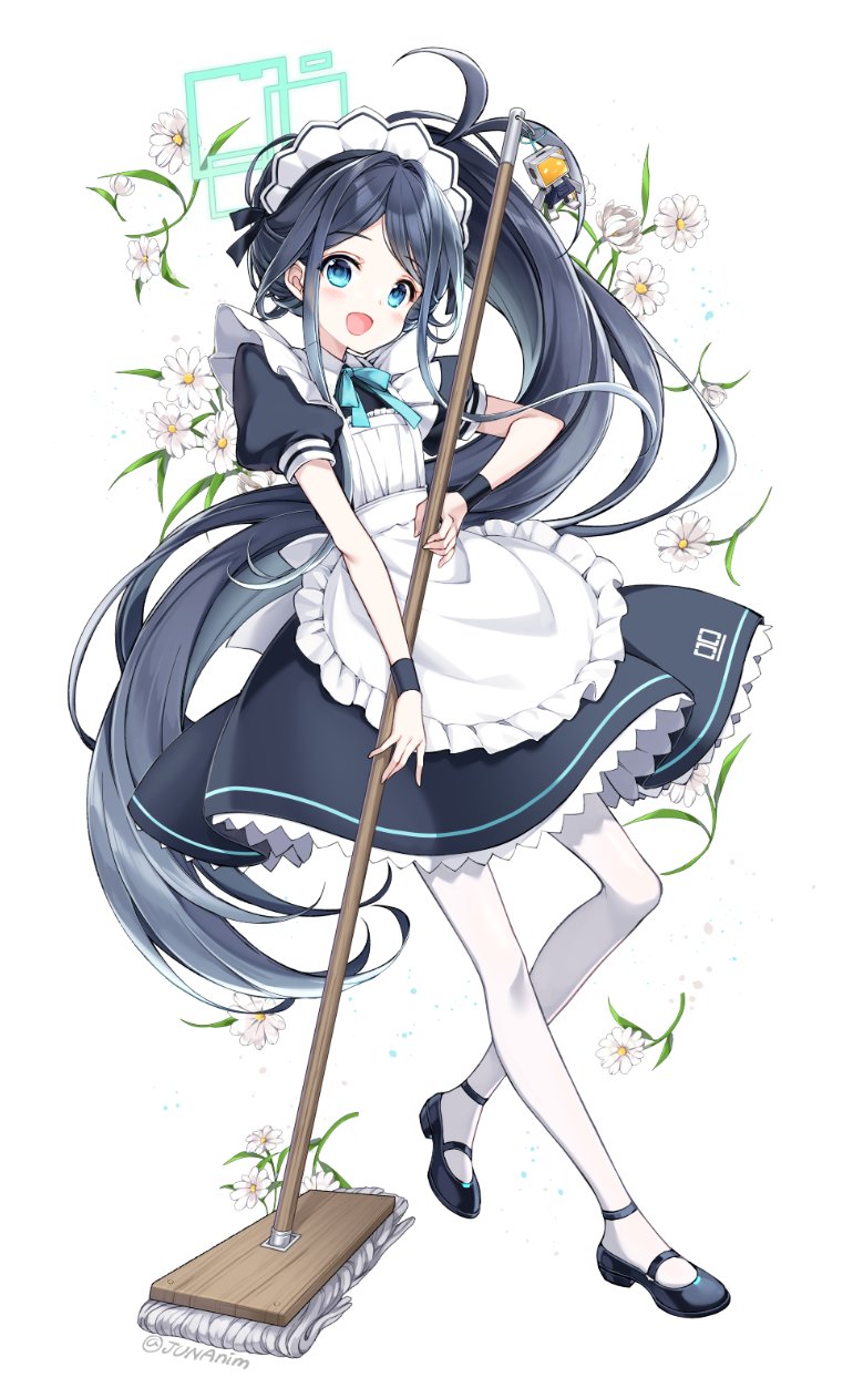 1girl antenna_hair apron aris_(blue_archive) aris_(maid)_(blue_archive) black_dress black_footwear black_hair blue_archive blue_bow blue_eyes blue_necktie blue_ribbon bow bowtie dress floating_hair floral_background flower full_body halo highres holding holding_mop juna kei_(robot)_(blue_archive) long_hair looking_at_viewer maid maid_apron maid_headdress mary_janes mop necktie official_alternate_costume official_alternate_hairstyle open_mouth pantyhose ponytail puffy_short_sleeves puffy_sleeves ribbon shoes short_sleeves sidelocks simple_background smile standing very_long_hair white_apron white_background white_flower white_pantyhose wristband