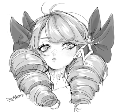 1girl bow greyscale gwen_(league_of_legends) hair_bow hair_ornament league_of_legends long_hair low_twintails lowres monochrome neko-me-kun signature solo symbol_in_eye teeth twintails