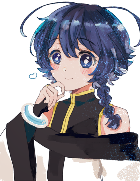 1boy bare_shoulders black_hair blue_eyes blush bracelet braid bridal_gauntlets closed_mouth hand_up heart jewelry long_sleeves medium_hair meng_long shy_(series) single_braid solo trap upper_body wami0303 white_background wide_sleeves
