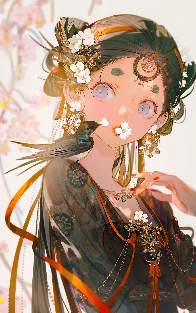 1girl animal animal_on_shoulder bird bird_on_shoulder black_dress black_hair blue_eyes blurry blurry_background branch colorful double_bun dress earrings floral_print flower flower_in_mouth hair_bun hair_flower hair_ornament headband jewelry knot light_blush lipstick long_hair long_sleeves makeup mian_lang nail_polish necklace original patterned_clothing pink_flower red_headband red_lips red_nails red_ribbon ribbon short_eyebrows simple_background solo thick_eyebrows upper_body white_flower