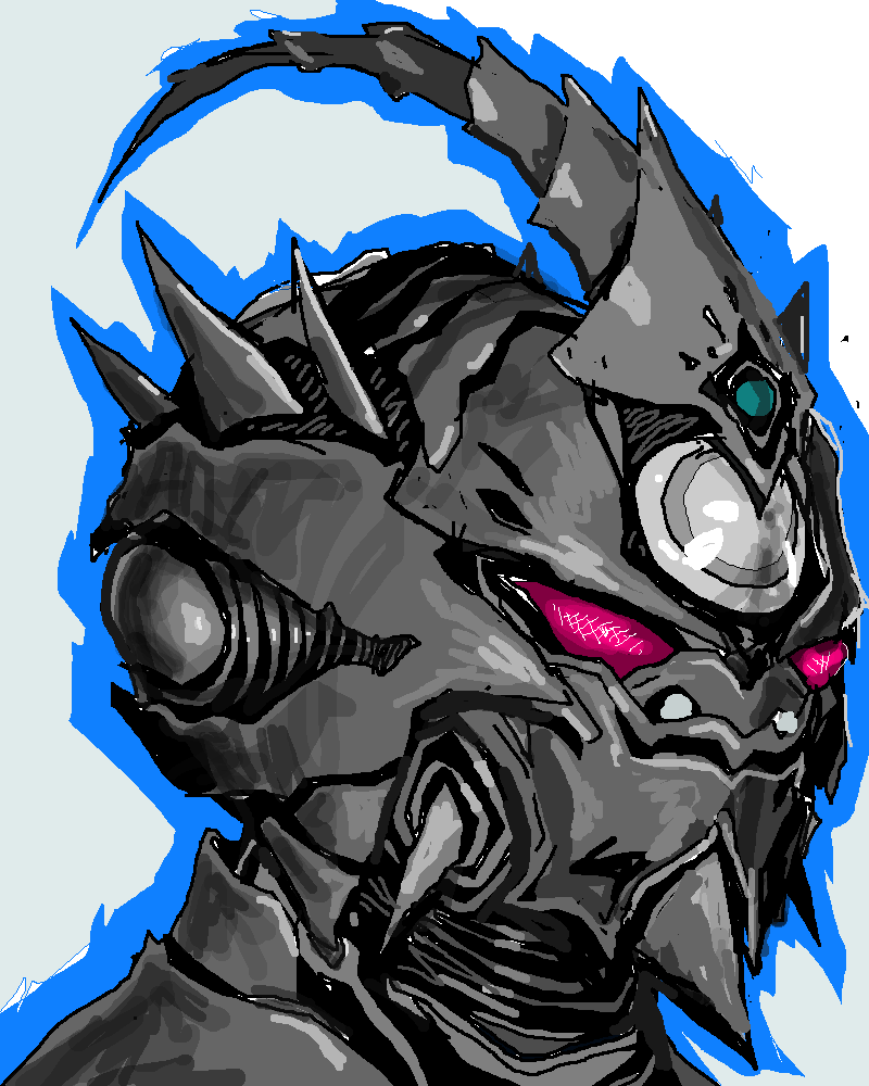 1boy armor drawfag grey_background guyver_iii kyoushoku_soukou_guyver looking_ahead male_focus portrait power_armor purple_eyes simple_background solo spikes