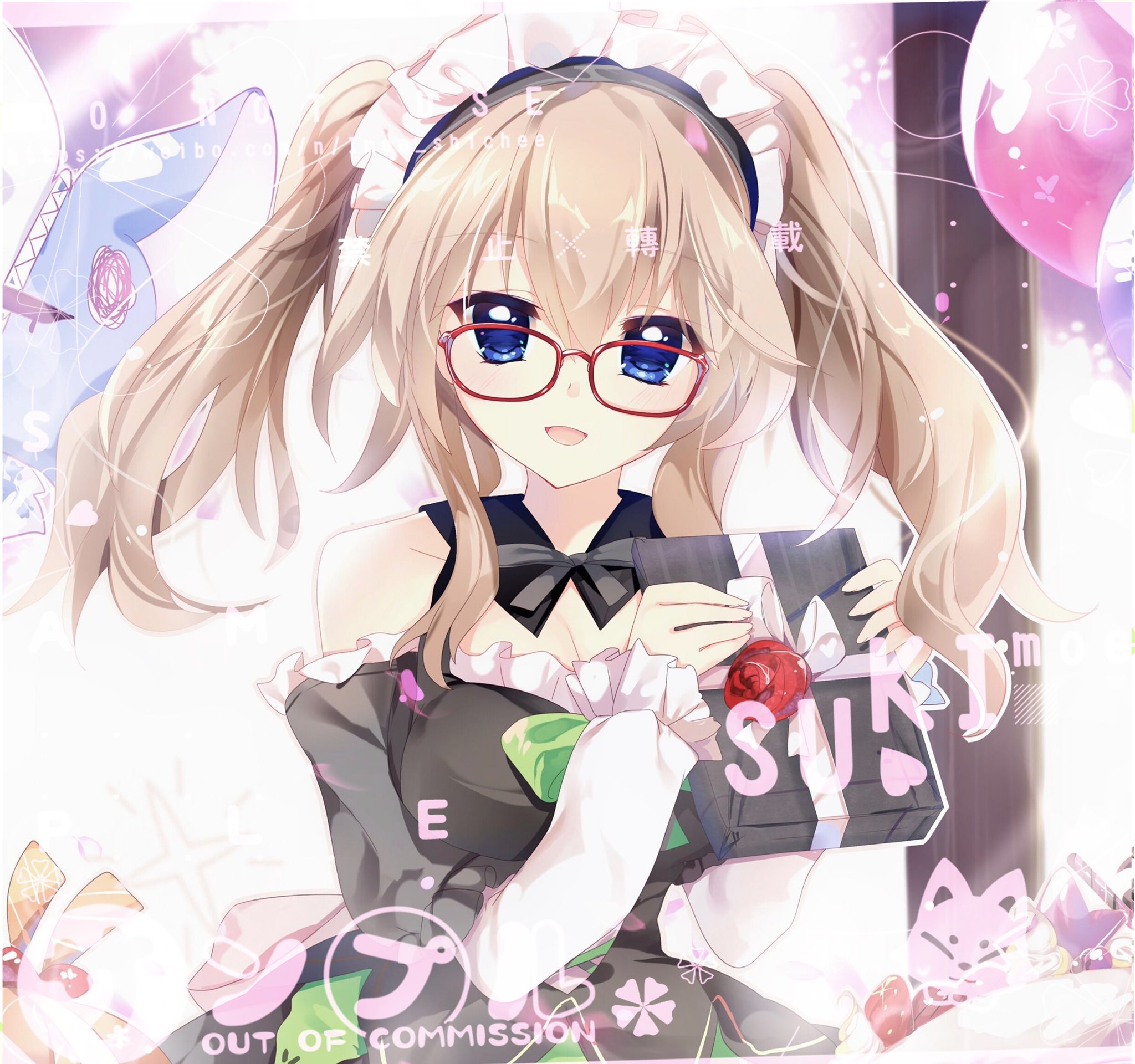 1girl 9-nine- :d bare_shoulders black_collar black_dress black_ribbon blush box breasts cleavage collar commentary_request detached_collar dress eyelashes eyes_visible_through_hair flower gift gift_box glasses hair_between_eyes highres holding holding_gift imoe_(1017933989) indoors kujou_miyako large_breasts light_brown_hair long_hair looking_at_viewer maid maid_headdress neck_ribbon official_alternate_costume official_alternate_hairstyle open_mouth red-framed_eyewear red_flower red_rose ribbon rose sidelocks smile solo straight-on twintails upper_body wavy_hair