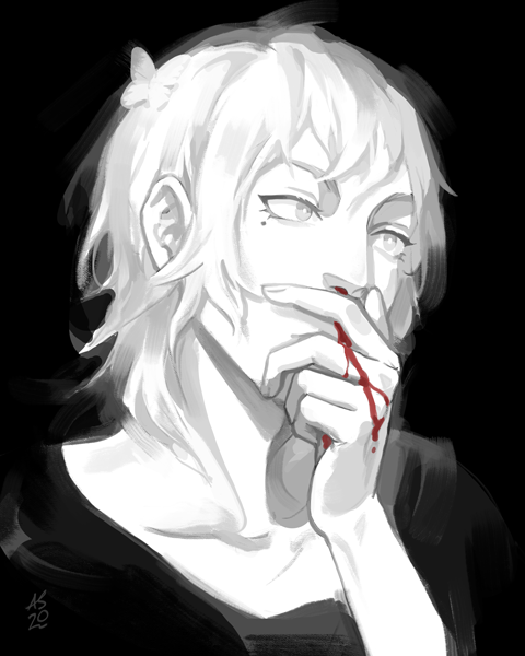 1boy black_background black_shirt blood bug butterfly driftwoodwolf ghost insect male_focus monochrome nosebleed original shirt simple_background solo upper_body