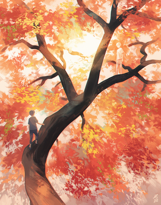 2boys autumn autumn_leaves black_hair black_pants driftwoodwolf ghost grey_shirt leaf male_focus maple_leaf multiple_boys original pants scenery shirt tree white_hair white_shirt