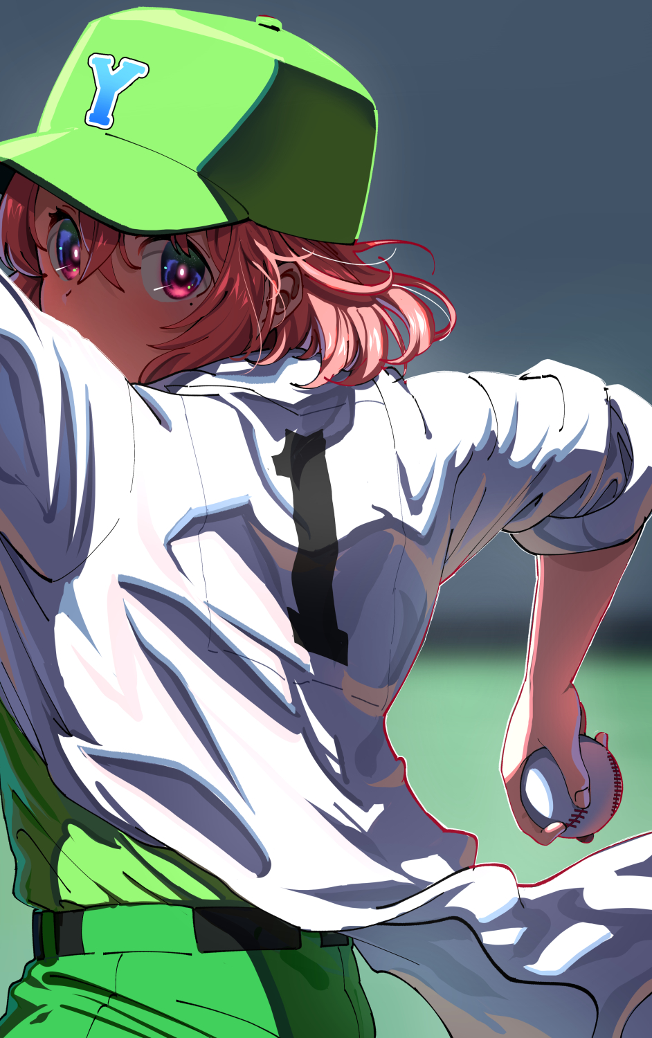 1girl ball baseball_(object) baseball_cap belt black_belt blurry blurry_background commentary_request day depth_of_field from_behind green_hat green_pants green_shirt hair_between_eyes hat highres holding holding_ball jacket looking_at_viewer looking_back nijisanji outdoors pants pettan_p red_eyes red_hair sasaki_saku shirt solo virtual_youtuber white_jacket