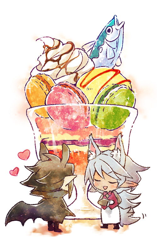 2boys animal_ear_fluff animal_ears black_cape black_hair black_pants black_shirt bow bowtie cape chibi closed_eyes commentary_request disgaea fenrich_(disgaea) food full_body gloves heart long_hair macaron makai_senki_disgaea_4 male_focus multiple_boys open_mouth pants parfait pointy_ears red_bow red_bowtie red_vest sardine sat0_u0 shirt smile tail valvatorez_(disgaea) vest white_background white_gloves wolf_tail