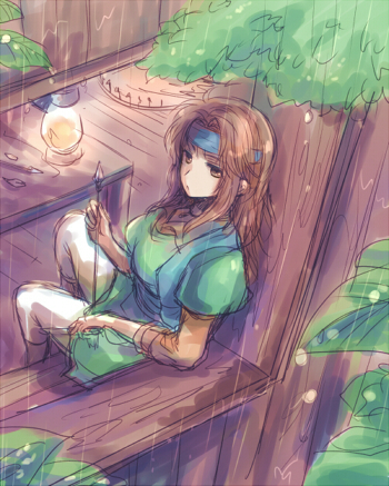 1girl arrow_(projectile) blue_headband blue_vest breasts brown_eyes brown_hair harushino headband holding holding_arrow lantern large_breasts leaf lowres raquel_(tear_ring_saga) sitting solo table tear_ring_saga tear_ring_saga:_yutona_eiyuu_senki tree vest