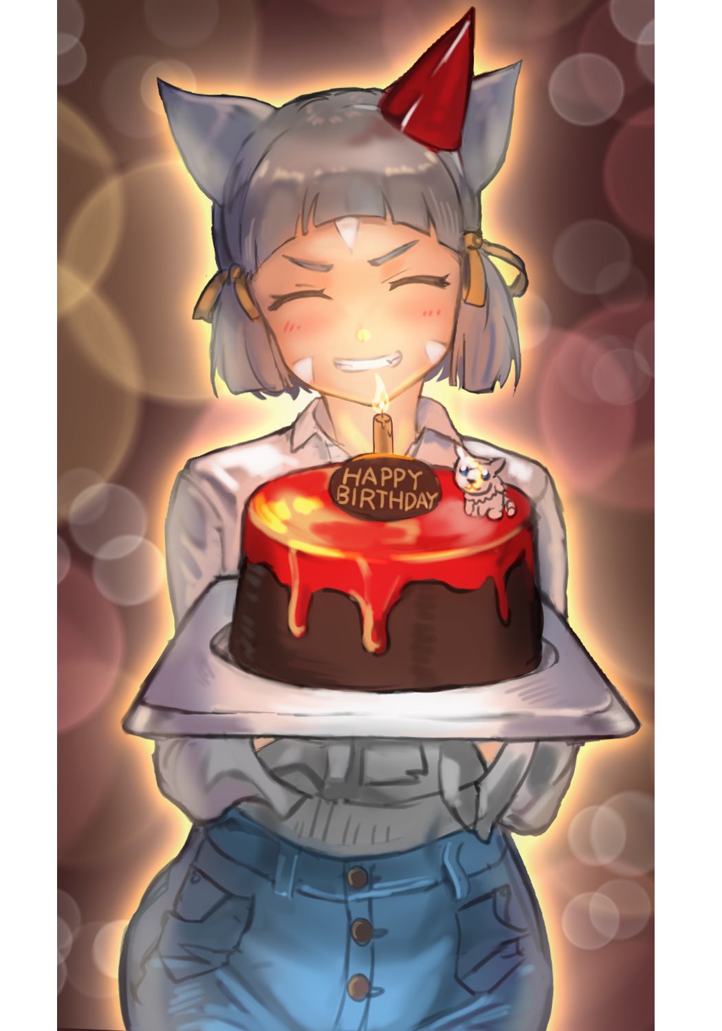 1girl ^_^ animal_ears birthday_cake blue_pants blush brown_background cake closed_eyes collared_shirt commentary_request facial_mark facing_viewer food grey_hair grin happy_birthday hat highres long_sleeves nia_(xenoblade) pants party_hat r123 red_hat shirt short_hair smile solo thick_eyebrows tilted_headwear v-shaped_eyebrows white_shirt xenoblade_chronicles_(series) xenoblade_chronicles_2
