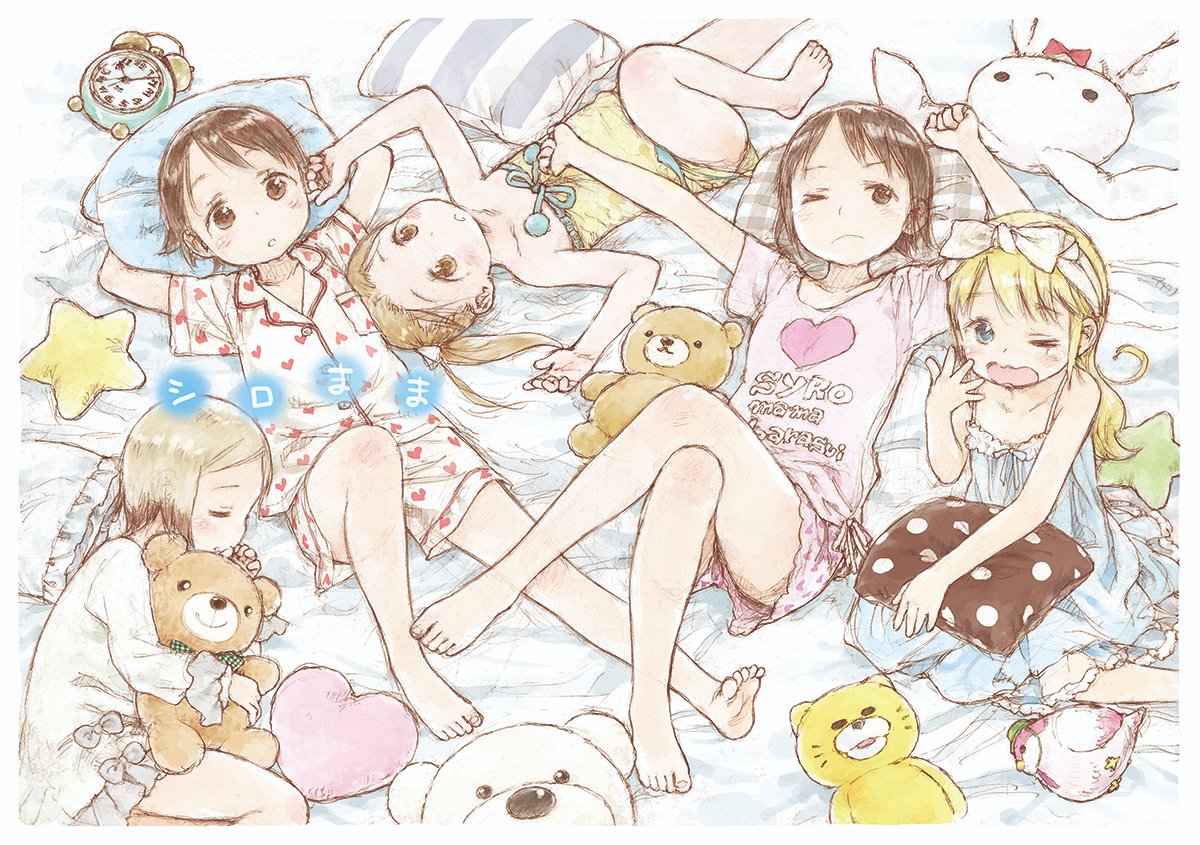 5girls alarm_clock ana_coppola barasui bed bed_sheet child clock flat_chest ichigo_mashimaro itou_chika itou_nobue matsuoka_miu multiple_girls pillow sakuragi_matsuri sleeping stuffed_animal stuffed_toy tagme teddy_bear