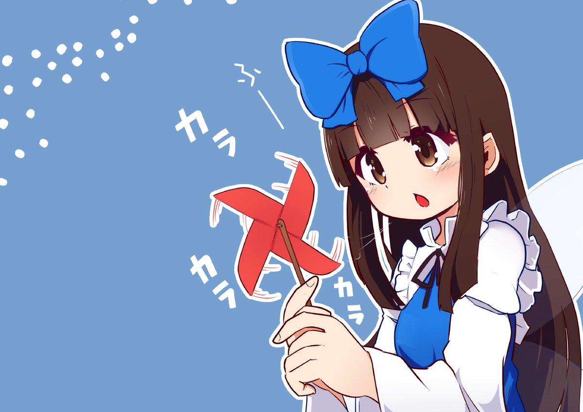 1girl blowing blue_background blue_bow blue_dress blush bow brown_eyes brown_hair chestnut_mouth commentary_request dress fairy_wings fingernails frilled_shirt_collar frills hair_bow holding holding_pinwheel kanisawa_yuuki long_hair long_sleeves negative_space open_mouth outline pinwheel puff_of_air sidelocks simple_background solo sound_effects star_sapphire touhou upper_body very_long_hair white_outline wide_sleeves wings