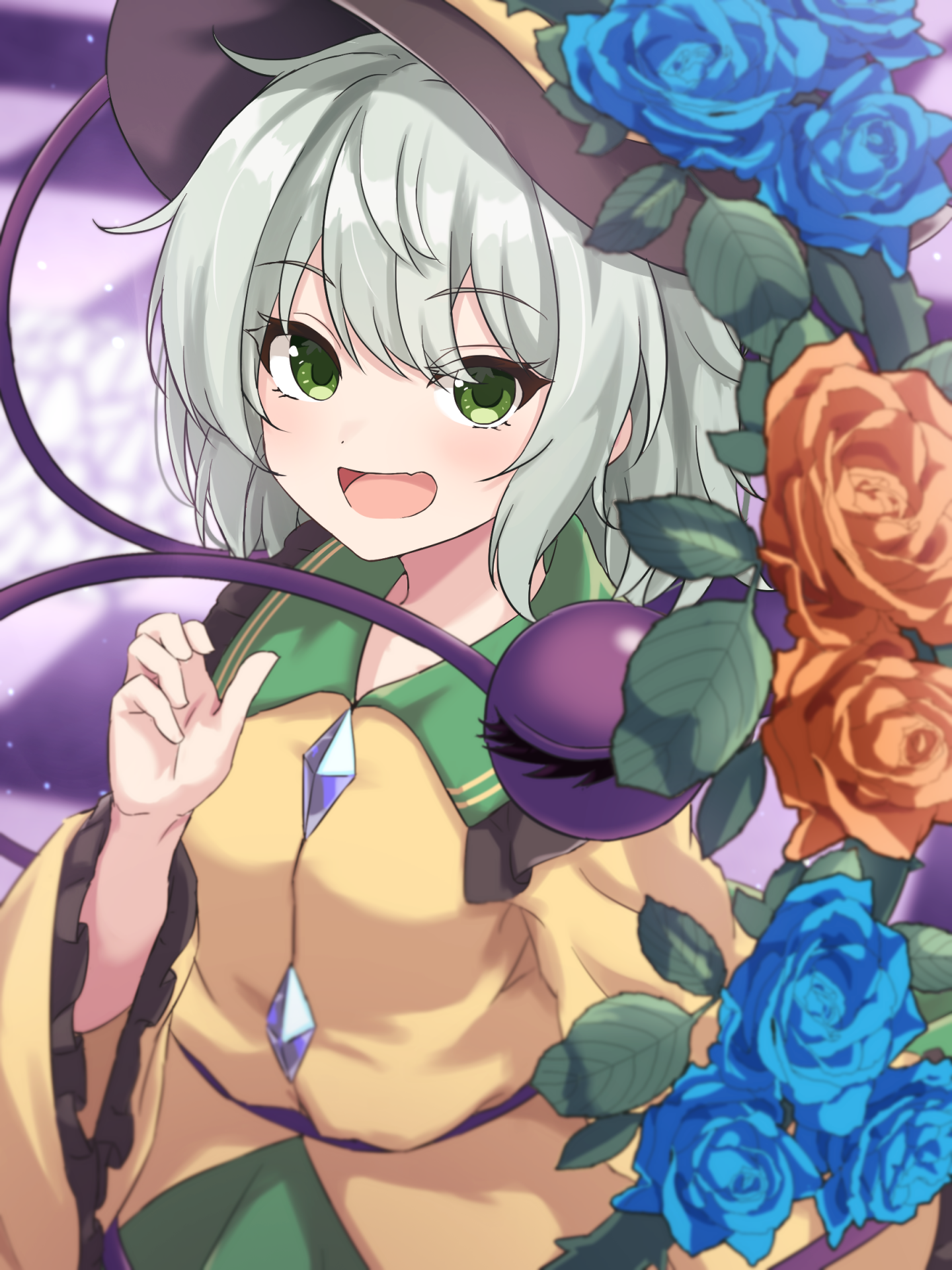 1girl :d black_hat blouse blue_flower blue_rose blurry blurry_background blush buttons checkered_floor commentary diamond_button flower frilled_shirt_collar frills green_eyes green_skirt grey_hair hand_up hat highres komeiji_koishi leaf looking_at_viewer open_mouth red_flower red_rose remiria100 rose shirt short_hair skirt smile solo third_eye touhou upper_body yellow_shirt