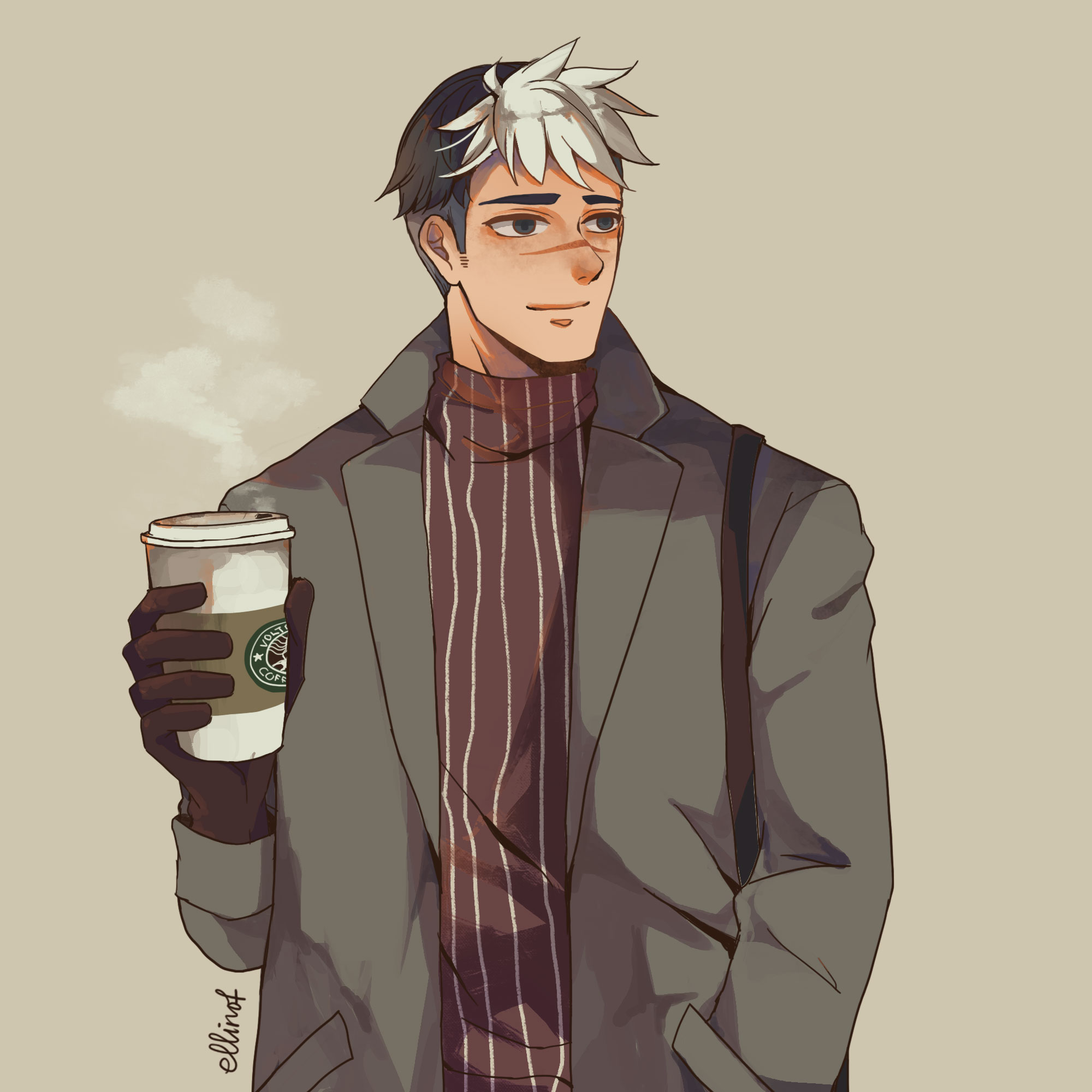 1boy black_gloves black_hair blush brand_name_imitation brown_shirt closed_mouth coffee commentary cup disposable_cup drink ellinot english_commentary gloves grey_background grey_eyes grey_jacket hand_in_pocket highres holding holding_cup holding_drink jacket lapels light_smile looking_ahead male_focus multicolored_hair nose_blush notched_lapels open_clothes open_jacket pinstripe_pattern pinstripe_shirt pocket scar scar_on_face shirt short_hair simple_background solo split-color_hair steam strap striped takashi_shirogane thick_eyebrows two-tone_hair upper_body very_short_hair voltron:_legendary_defender voltron_(series) white_hair