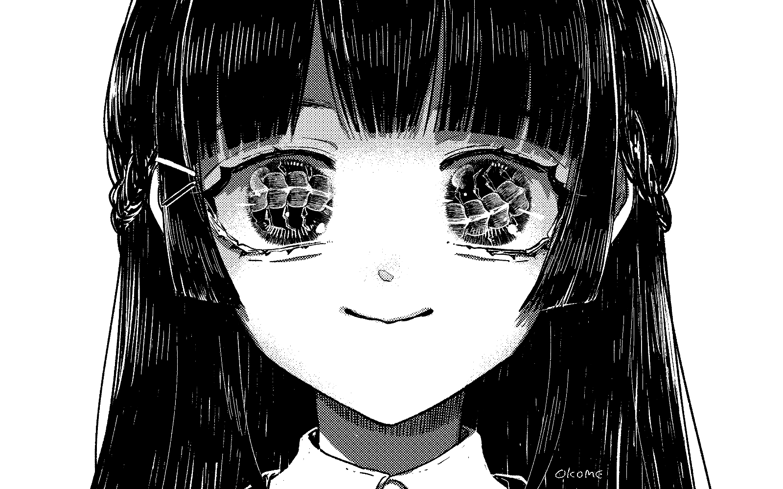 1girl artist_name blunt_bangs bug centipede close-up closed_mouth collared_shirt commentary eye_focus greyscale hair_ornament hairclip half_updo highres hime_cut long_hair looking_at_viewer monochrome nijisanji okomeumapi portrait shirt sidelocks simple_background smile solo straight-on symbol_in_eye tsukino_mito tsukino_mito_(1st_costume) virtual_youtuber wide-eyed