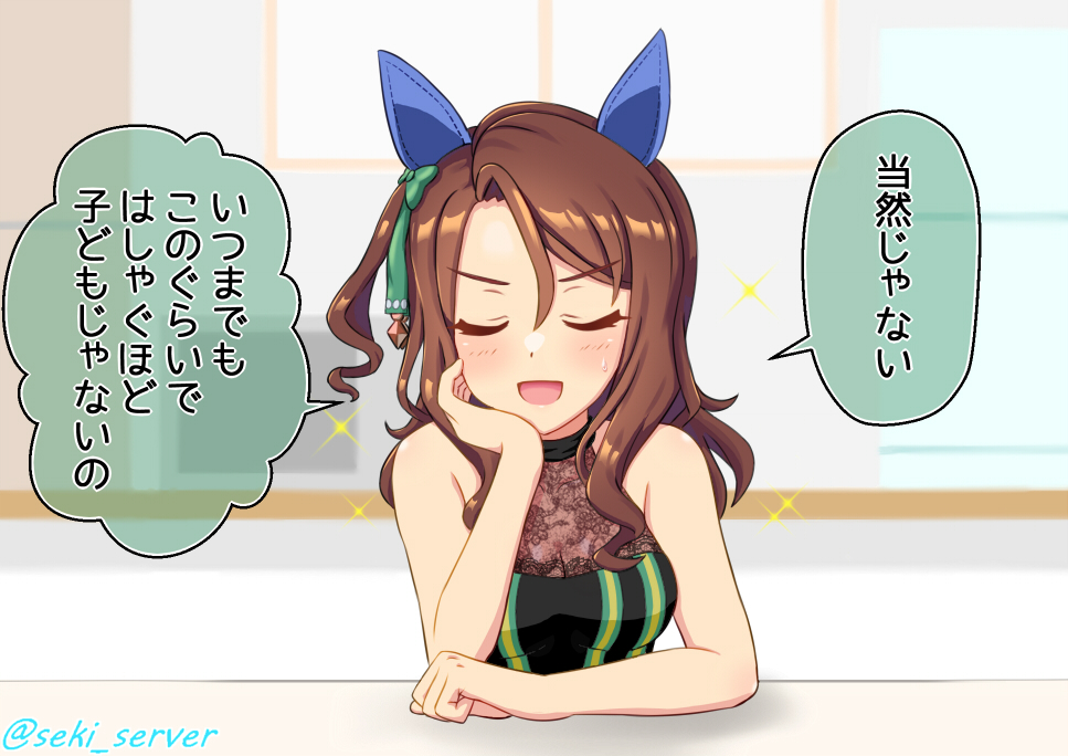 1girl animal_ears bare_shoulders blush breasts brown_hair cleavage closed_eyes commentary_request ear_covers hair_between_eyes horse_ears horse_girl indoors king_halo_(umamusume) medium_breasts seki_(hyokosho) smile solo speech_bubble talking translation_request twitter_username umamusume wavy_hair