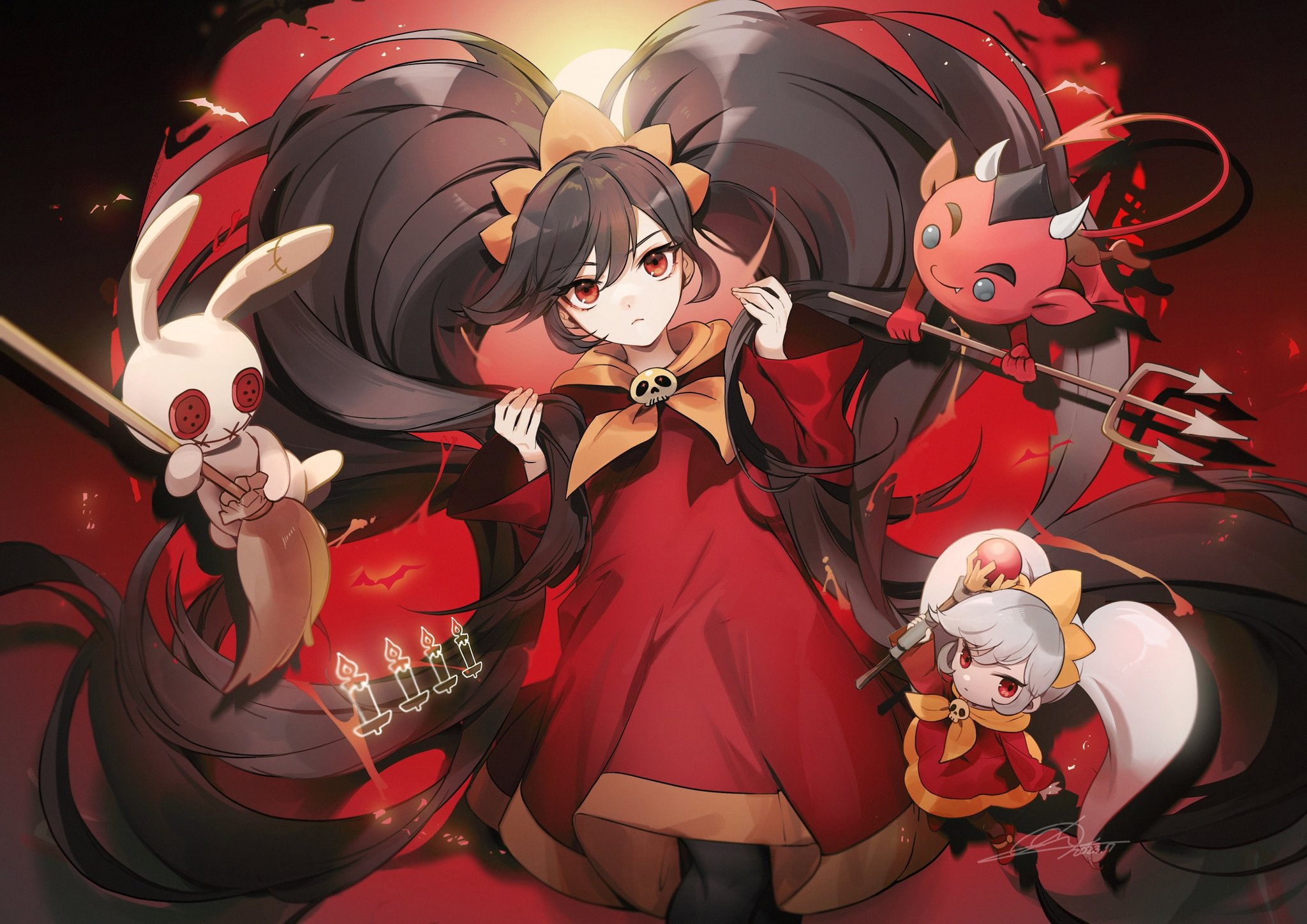 1boy 2girls ashley_(warioware) black_hair broom chibi closed_mouth crossed_legs demon demon_boy highres holding holding_wand long_hair long_sleeves looking_at_viewer multiple_girls nintendo no-kan pitchfork red_(warioware) red_eyes red_robe robe sitting skull stuffed_animal stuffed_toy twintails very_long_hair wand warioware white_hair