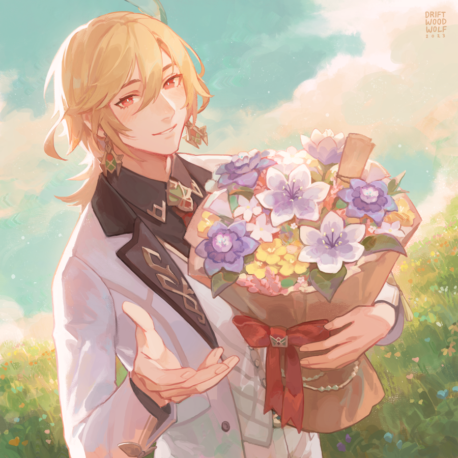 1boy artist_name blonde_hair bouquet bow buttons cloud cloudy_sky dress_shirt driftwoodwolf earrings feather_hair_ornament feathers flower formal_clothes genshin_impact grass hair_ornament holding holding_bouquet jacket jewelry kaveh_(genshin_impact) lapels long_sleeves looking_at_viewer male_focus open_clothes open_jacket pants reaching reaching_towards_viewer red_bow red_eyes shirt sky smile solo suit teeth vest white_jacket white_pants white_vest wing_collar