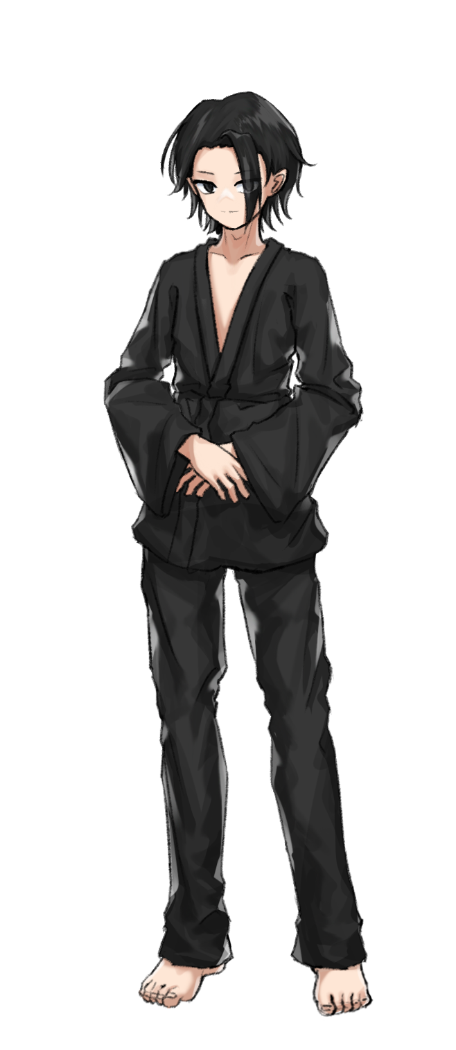 1boy barefoot black_eyes black_hair black_pants black_shirt closed_mouth commentary_request dougi expressionless eyes_visible_through_hair full_body hair_between_eyes highres hirano_gengorou long_bangs long_sleeves looking_at_viewer male_focus manatsu_no_yo_no_inmu pants shirt short_hair simple_background solo standing transparent_background traveler_hxy