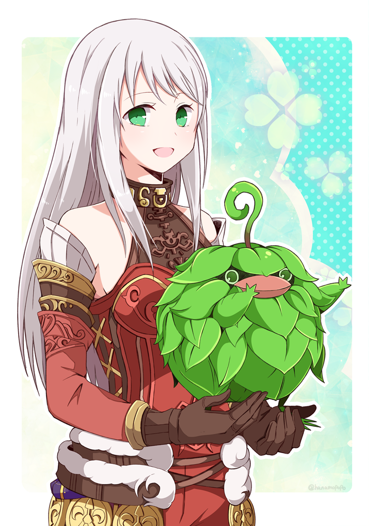 1girl :d aqua_eyes arciela_v_adoulin bare_shoulders breasts brown_gloves creature detached_sleeves final_fantasy final_fantasy_xi fur_trim gloves grey_hair holding holding_creature hume leaf leafkin long_hair long_sleeves medium_breasts ntapopo open_mouth pink_sleeves smile solo standing twitter_username