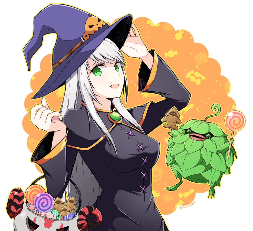 1girl :d arciela_v_adoulin black_capelet black_dress breasts brooch candy capelet cookie creature dress final_fantasy final_fantasy_xi food gem green_eyes green_gem grey_hair halloween_bucket hands_up hat jewelry leafkin lollipop long_hair long_sleeves medium_breasts ntapopo open_mouth outline purple_hat smile solo swirl_lollipop twitter_username witch_hat yellow_outline